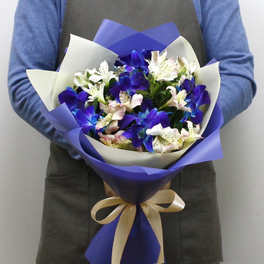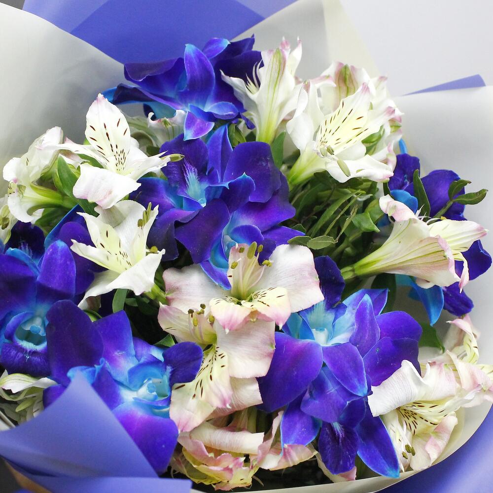 Альстромерия – 5 шт.Рускус – 6 шт.Лента атласная – 1 шт.удлинитель для орхидеи – 6 шт.Средство для продления жизни цветов – 1 шт.Дизайнерская упаковка – 2 шт.инструкция по уходу за цветами – 1 шт.любовь флориста (бесплатно) – 1 шт.орхидея дендробиум синяя цветочки – 12 шт.