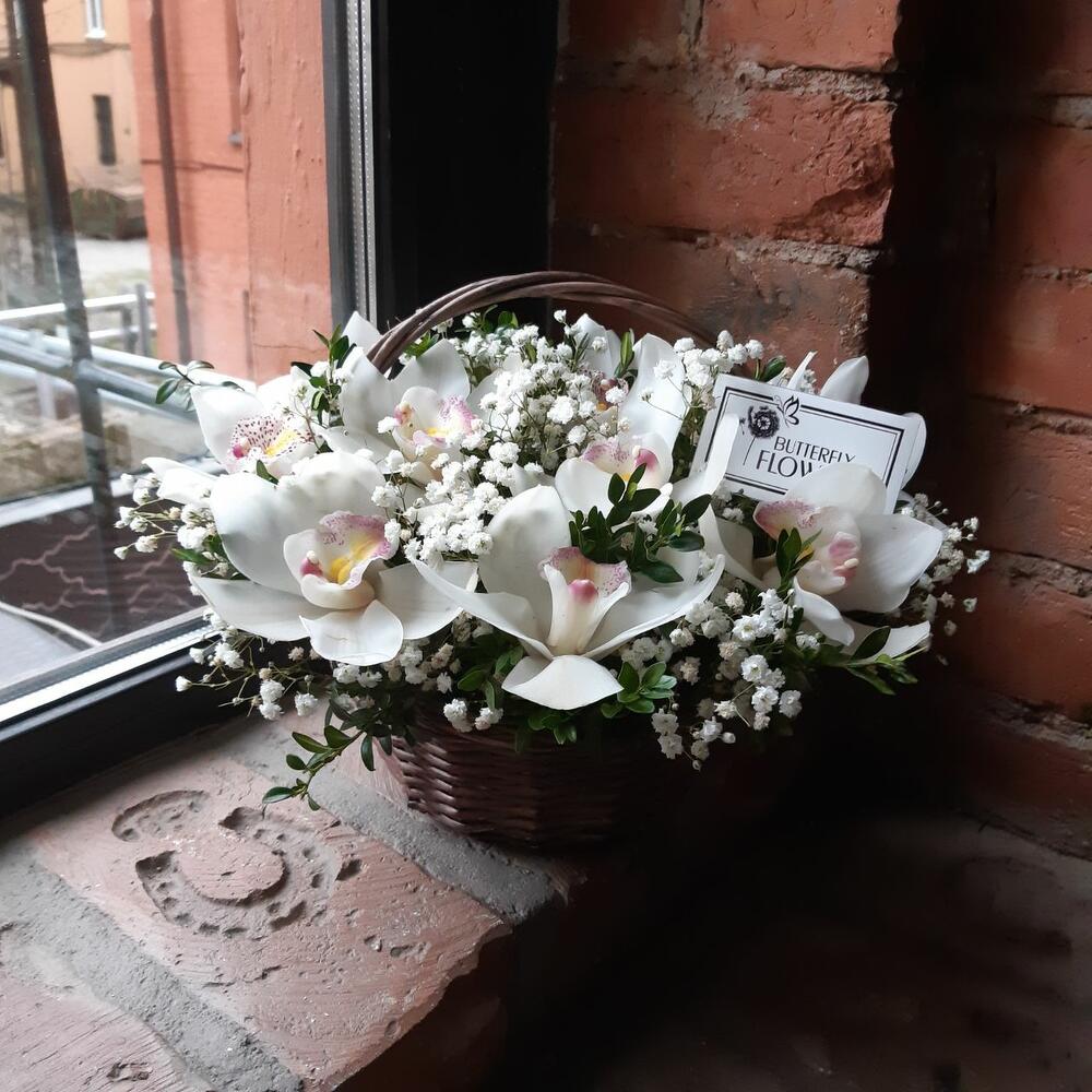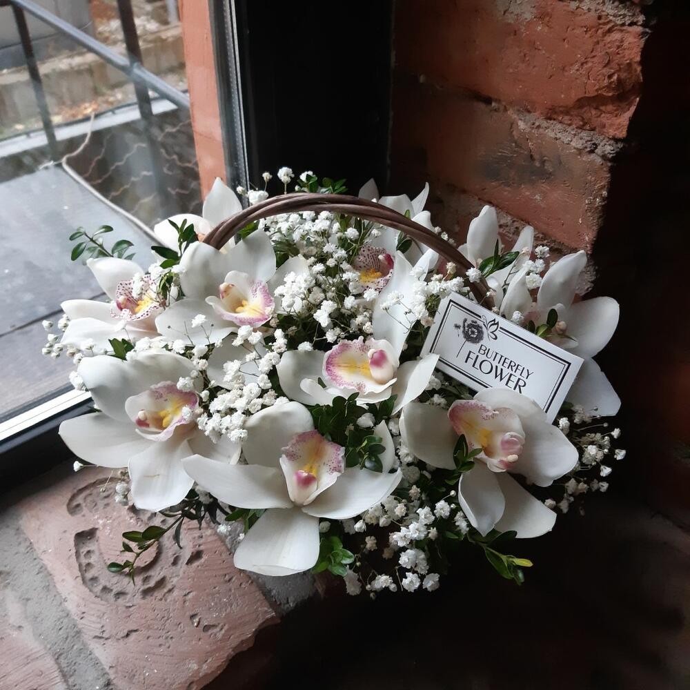 ЦИМБИДИУМ – 11 шт.Самшит – 5 шт.Гипсофила – 5 шт.Корзина – 1 шт.Оазис – 1 шт.