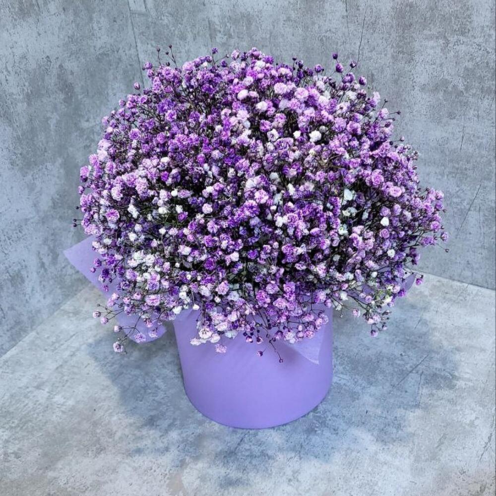 “Сиреневый туман” – композиция из гипсофилы в шляпной коробке