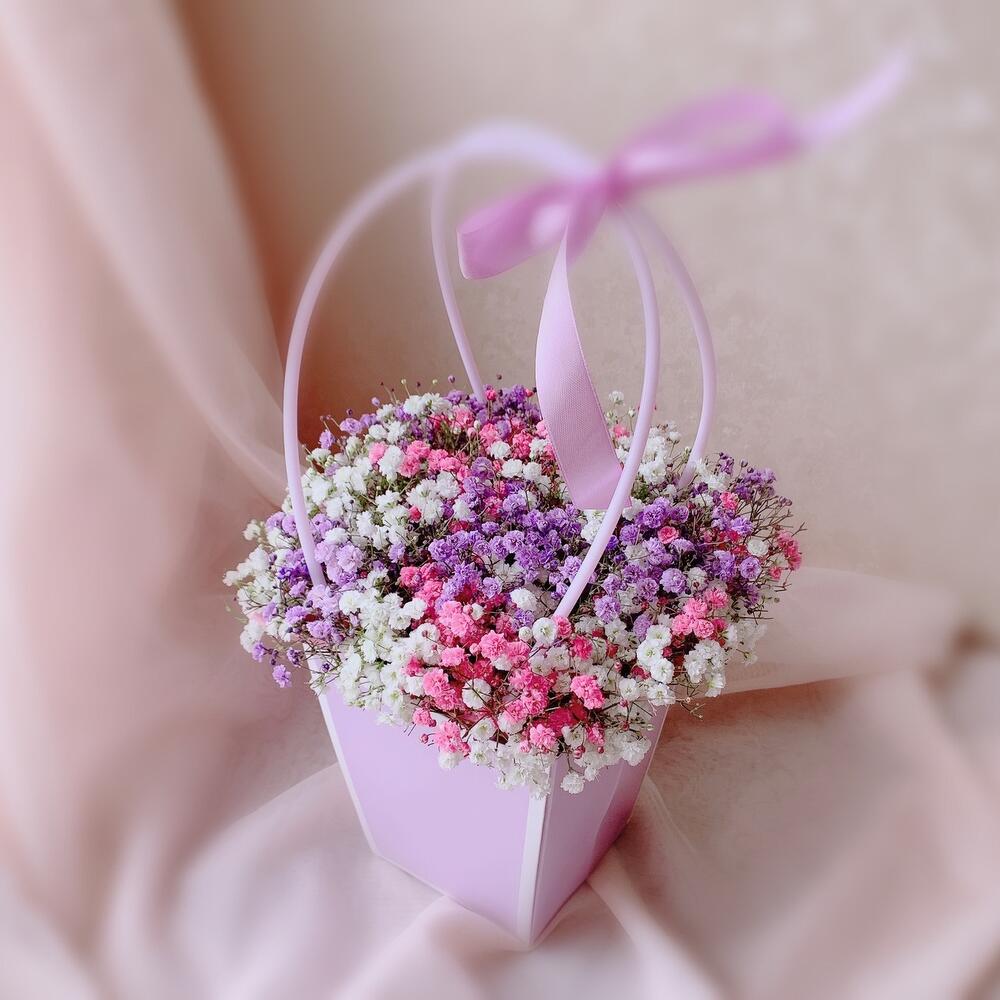 Лента атласная – 1 шт.Сумочка – 1 шт.Флористическая губка – 1 шт.Мягкая игрушка зайка – 1 шт.радужная гипсофила – 5 шт.