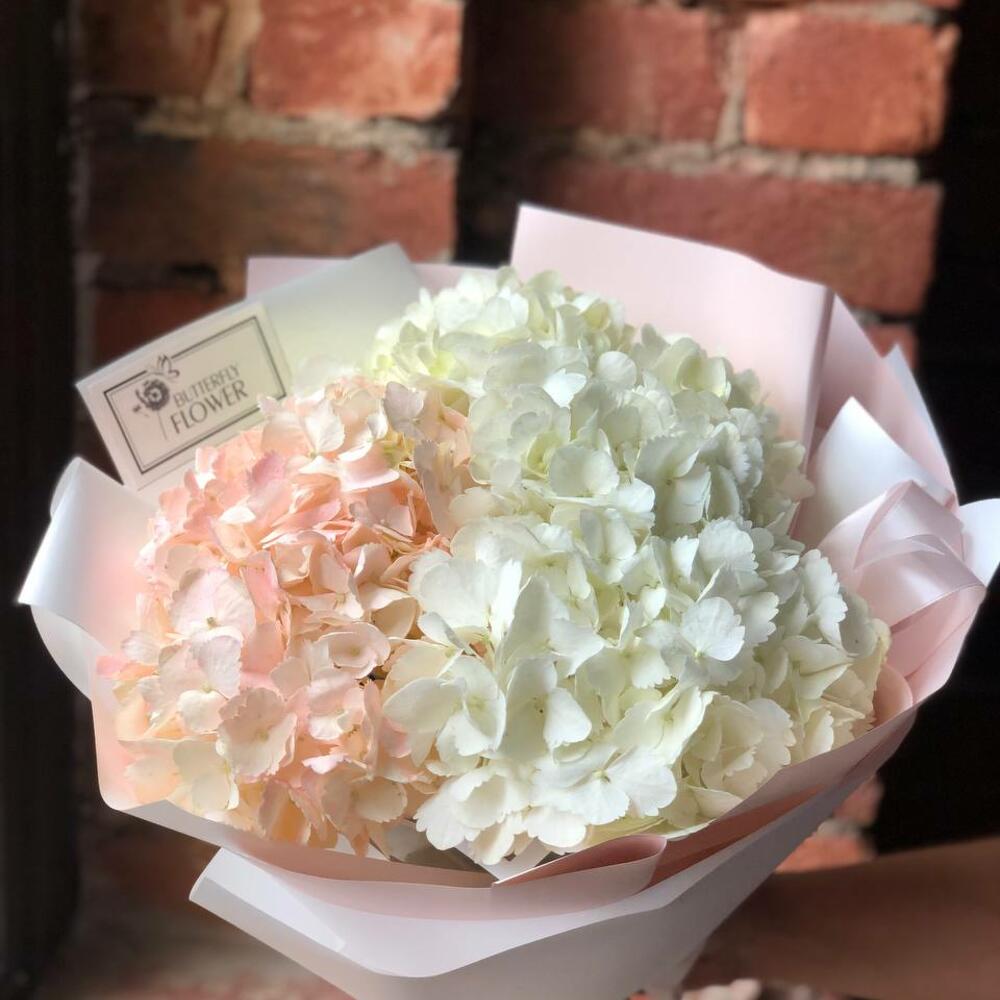 Букет из 3 белых и розовых гортензий в стильной упаковке “Свияш”