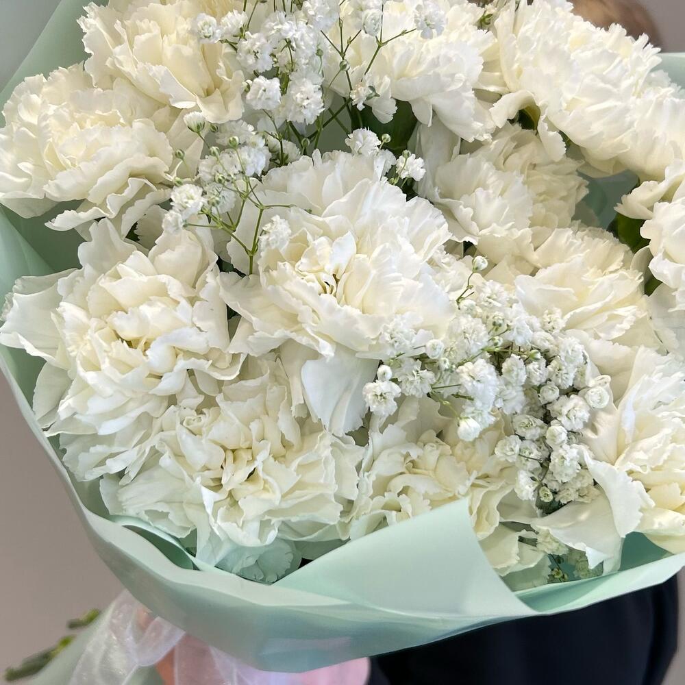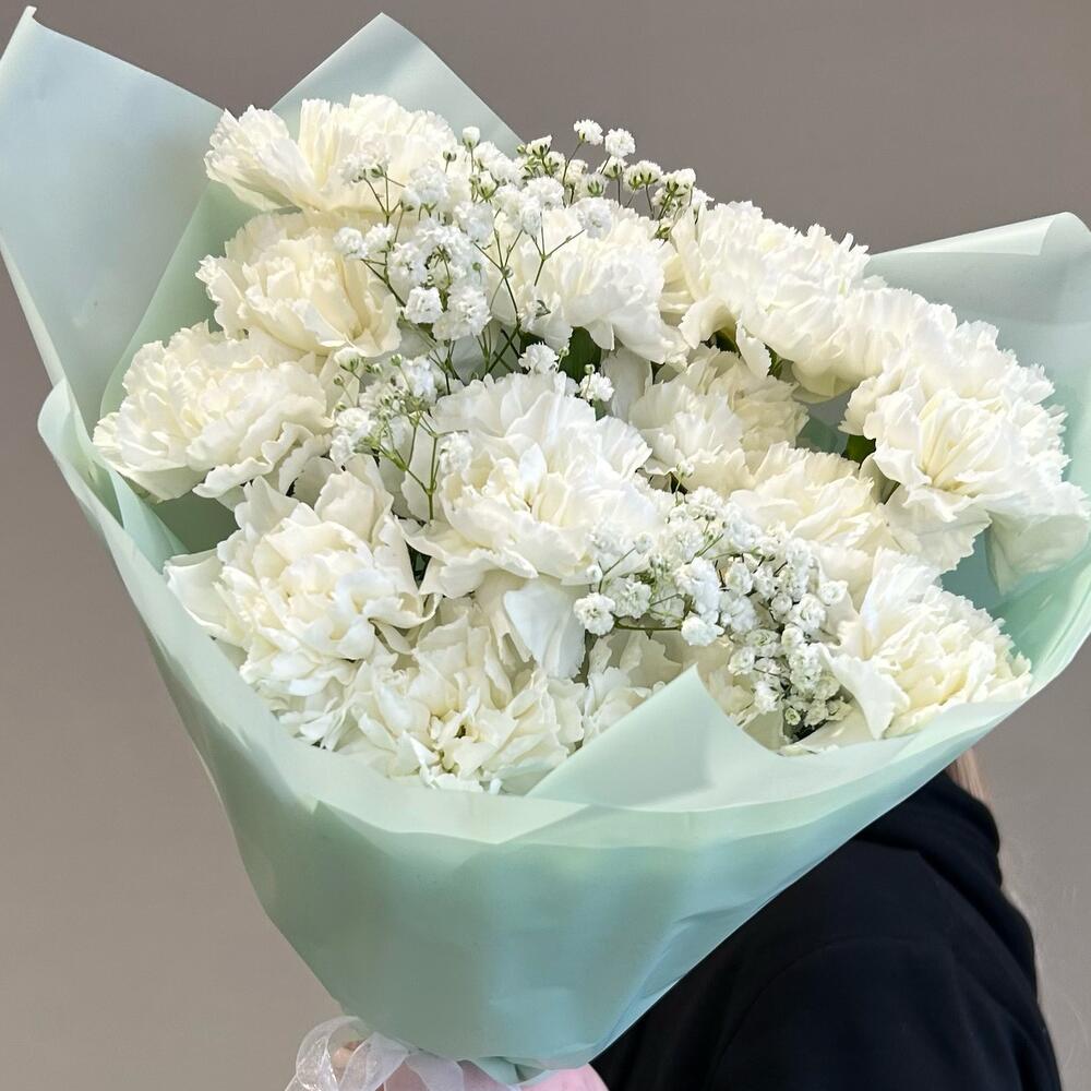 Букет из белых стойких сортовых диантусов и белых гипсофил в упаковке
