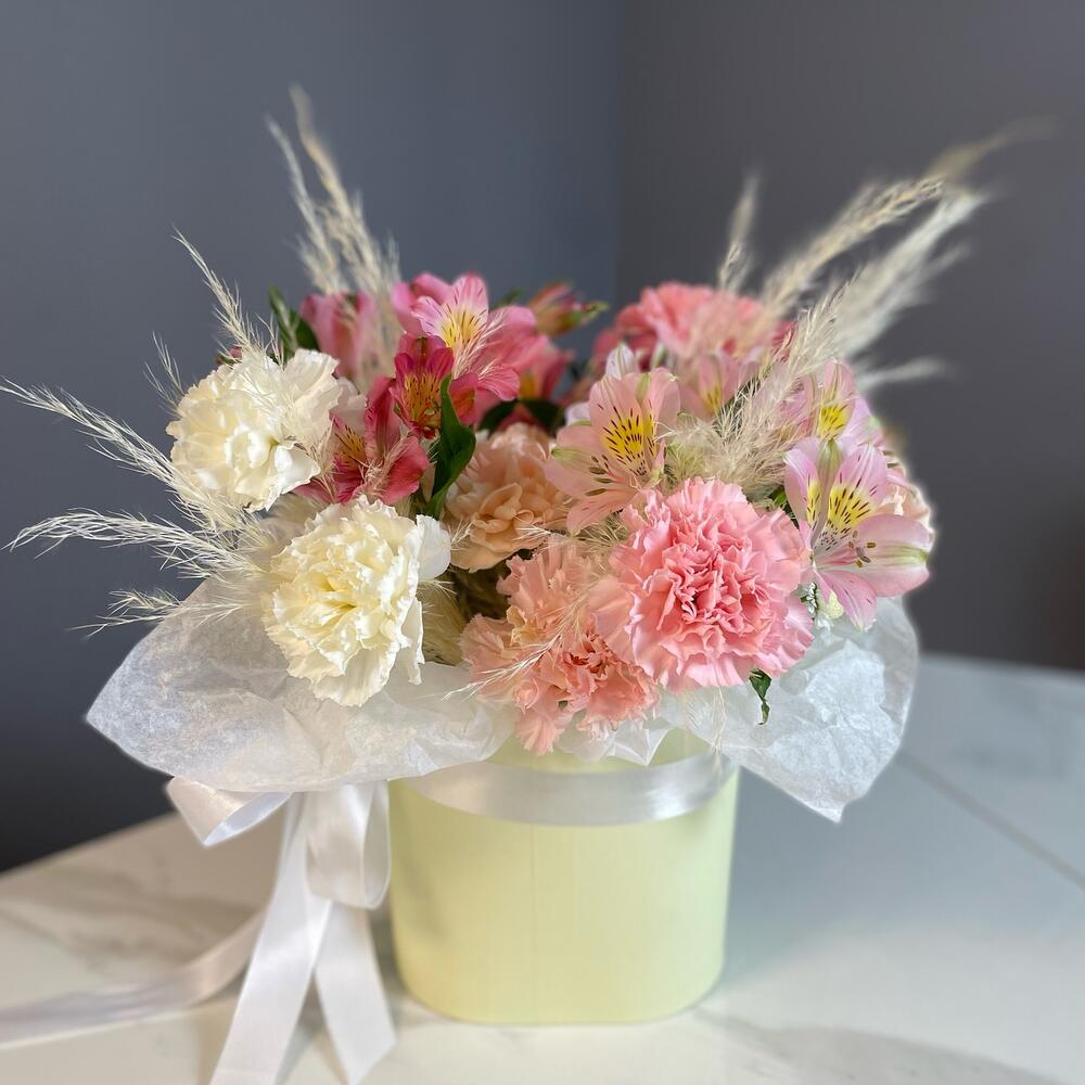 Цветочная композиция из альстромерий и гвоздик в коробке
