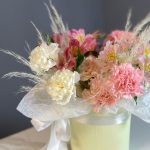Альстромерия – 3 шт.Гвоздика – 9 шт.Лента атласная – 1 шт.Тишью – 1 шт.Сухоцветы – 3 шт.Шляпная коробка – 1 шт.Оазис флористический – 1 шт.
