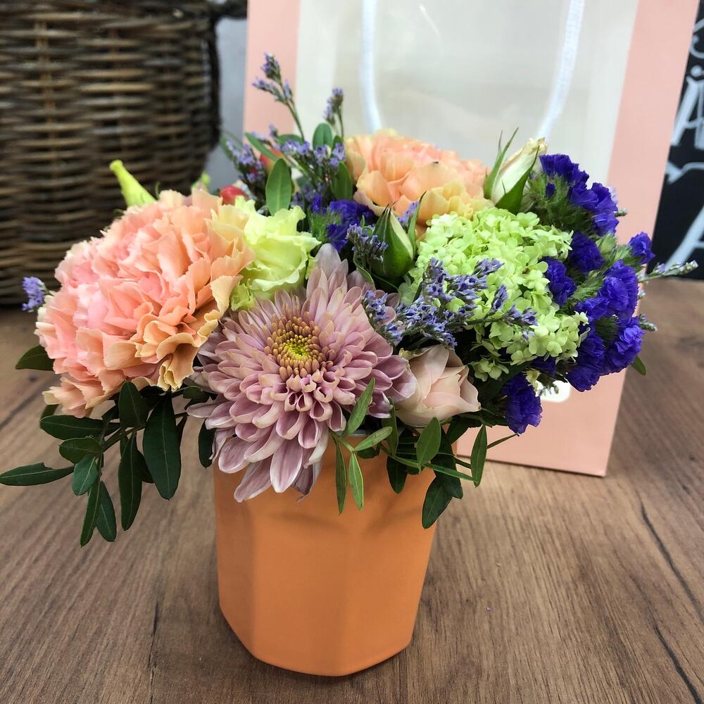 Яркая цветочная композиция в керамической кружке в подарочном пакете с окошком отличный готовый подарок