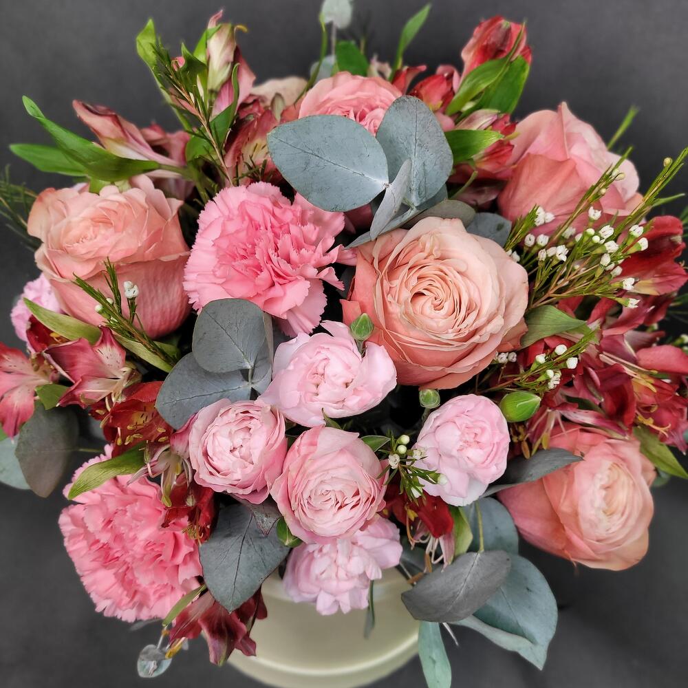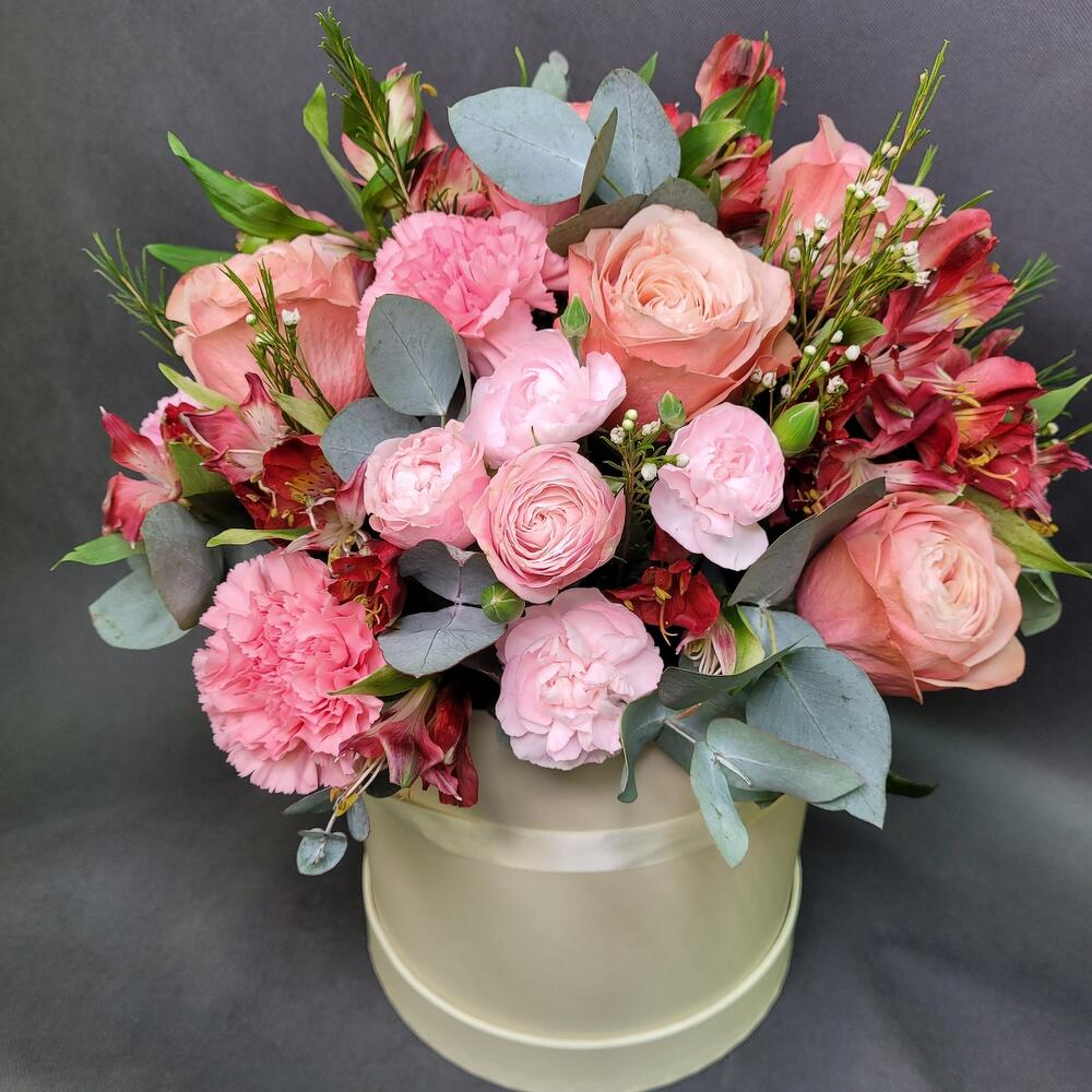 Роза Эквадор – 5 шт.Роза кустовая пионовидная – 2 шт.Диантус – 5 шт.Альстромерия – 3 шт.Диантус кустовой – 3 шт.зелень декоративная – 5 шт.Шляпная коробка – 1 шт.Оазис флористический – 1 шт.