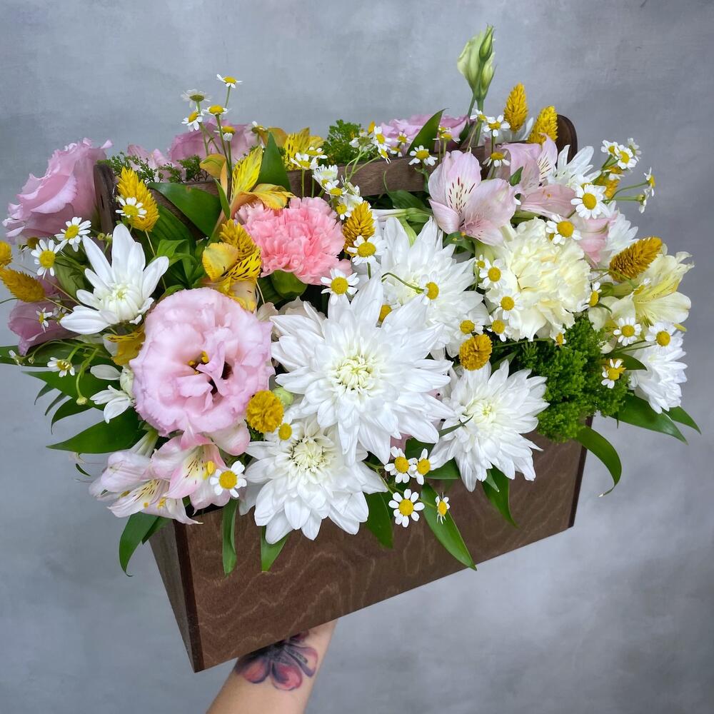 Альстромерия – 5 шт.Лизиантус – 4 шт.Рускус – 2 шт.Гвоздика – 5 шт.Подсолнух – 1 шт.Матрикария – 3 шт.Фаларис – 20 шт.
