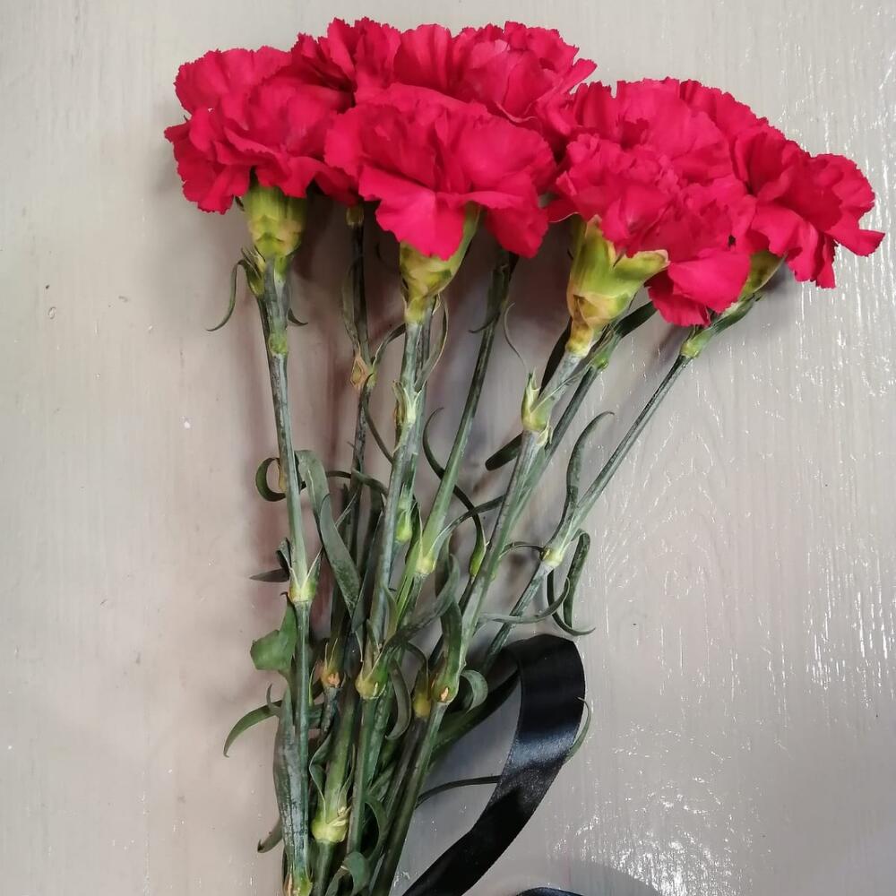 Красная гвоздика 10шт с траурной лентой