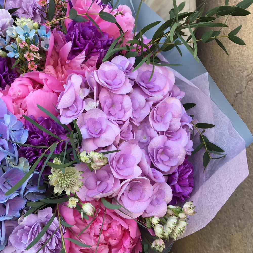 Гортензия – 3 шт.Пион – 7 шт.Эвкалипт – 8 шт.Гвоздика – 9 шт.Лента атласная – 2 шт.Тишью – 4 шт.Упаковка дизайнерская – 5 шт.Астранция – 4 шт.Твидия – 6 шт.