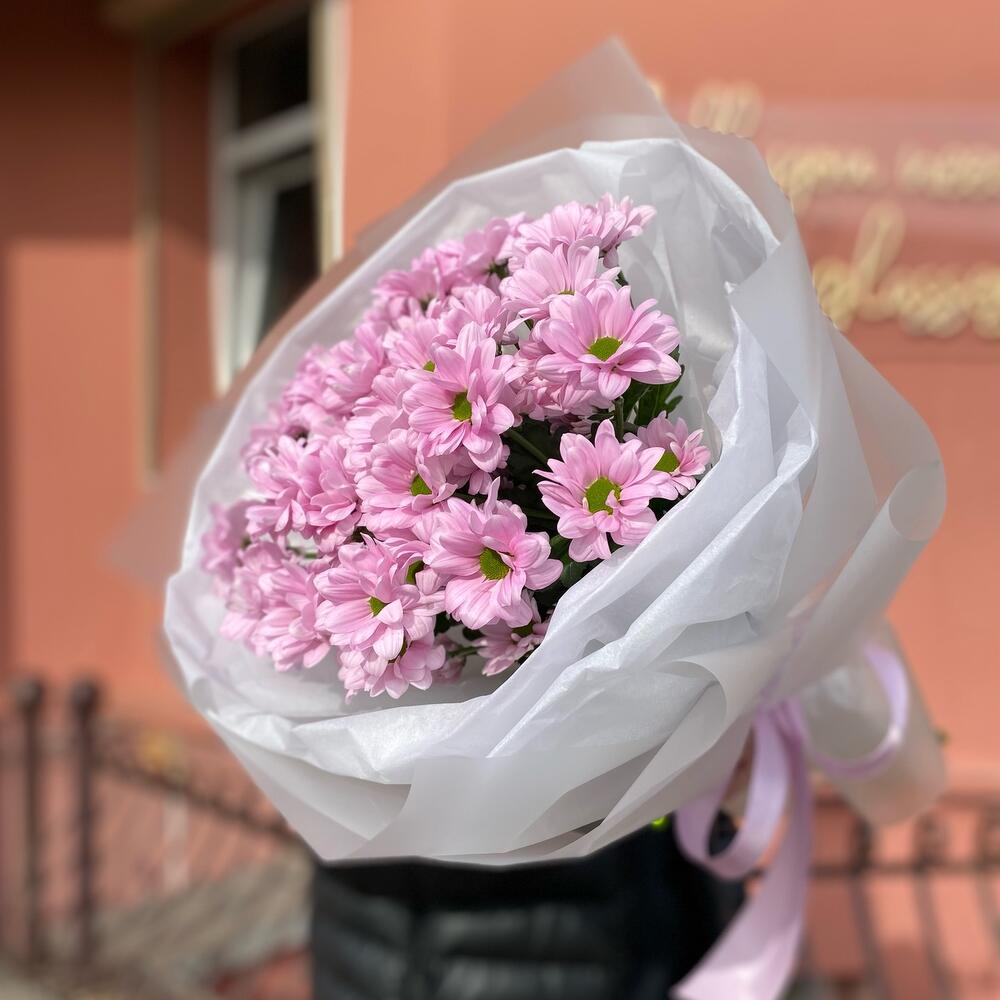 Лента атласная – 1 шт. Тишью – 1 шт. Ромашковая хризантема – 5 шт. Дизайнерская упаковка – 1 шт.