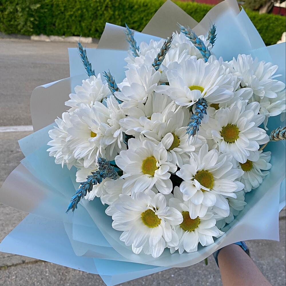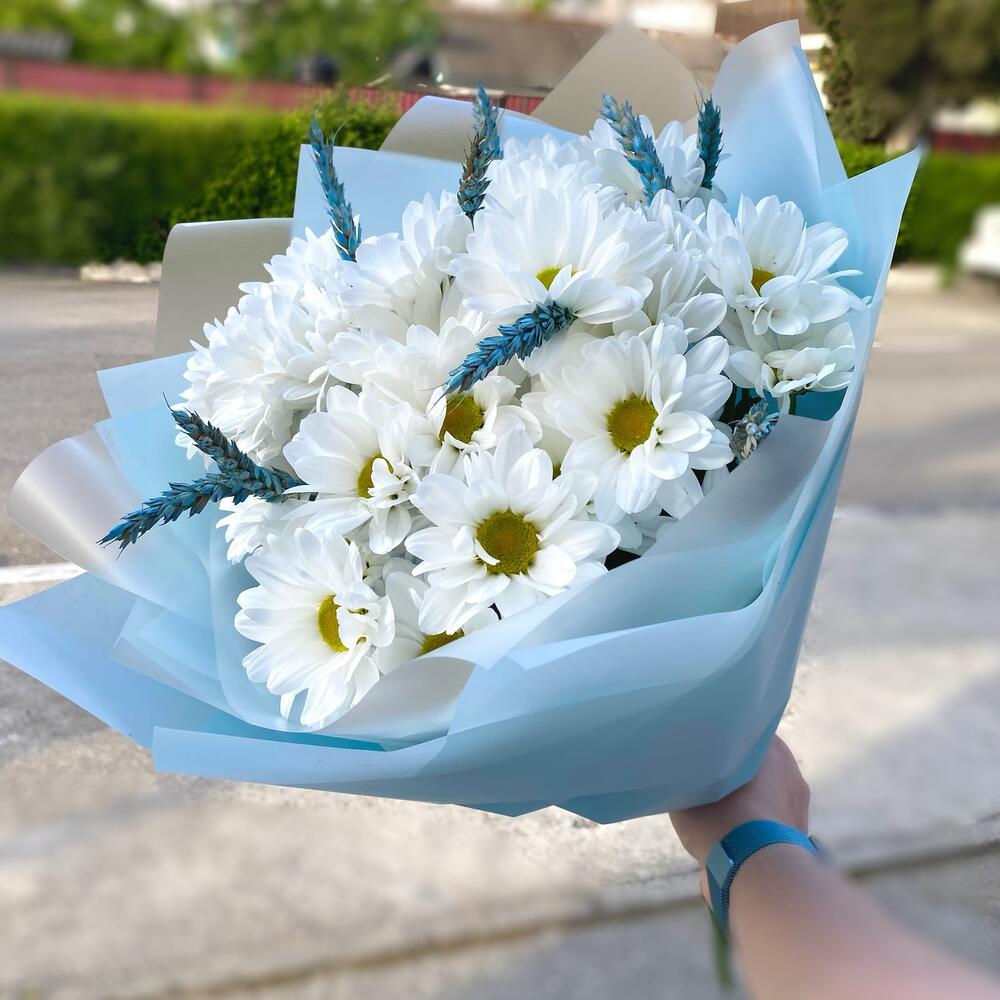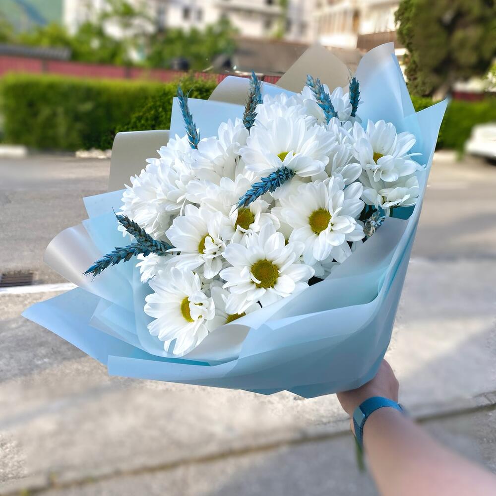 Лента атласная – 1 шт.Сухоцветы – 11 шт.Хризантема Ромашковая – 5 шт.Пленка матовая – 3 шт.тишью голубое – 2 шт.