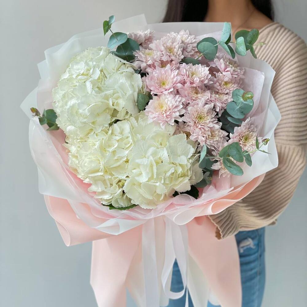 Сборный пышный букет из королевской гортензии и хризантемы! Будет радовать Вашего получателя еще долгое время
