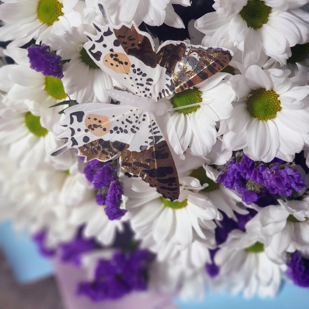 Хризантема кустовая – 7 шт.Лента атласная – 1 шт.Статица синяя – 4 шт.Пленка матовая – 2 шт.Открыточка с вашими пожеланиями – 1 шт.Бабочка декоративная – 1 шт.