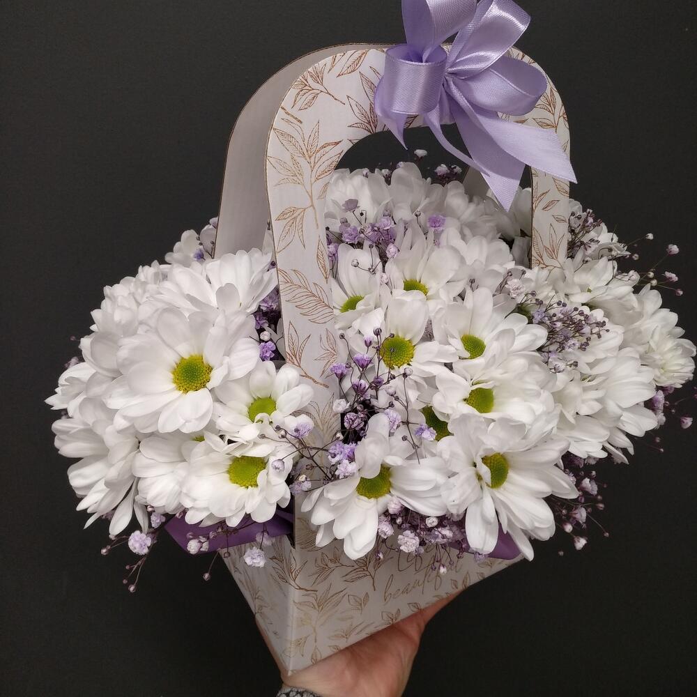 Сумка крафт – 1 шт.Оазис флористический – 1 шт.Гипсофила – 2 шт.Хризантема кустовая – 5 шт.Лента атласная – 2 шт.