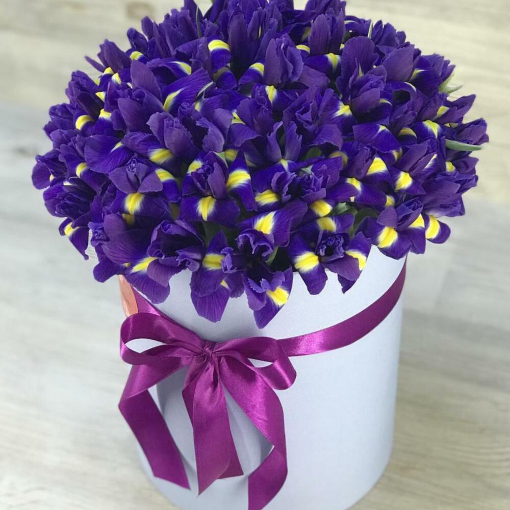 Ирис – 51 шт.Шляпная коробка с лентой – 1 шт.Оазис флористический – 1 шт.
