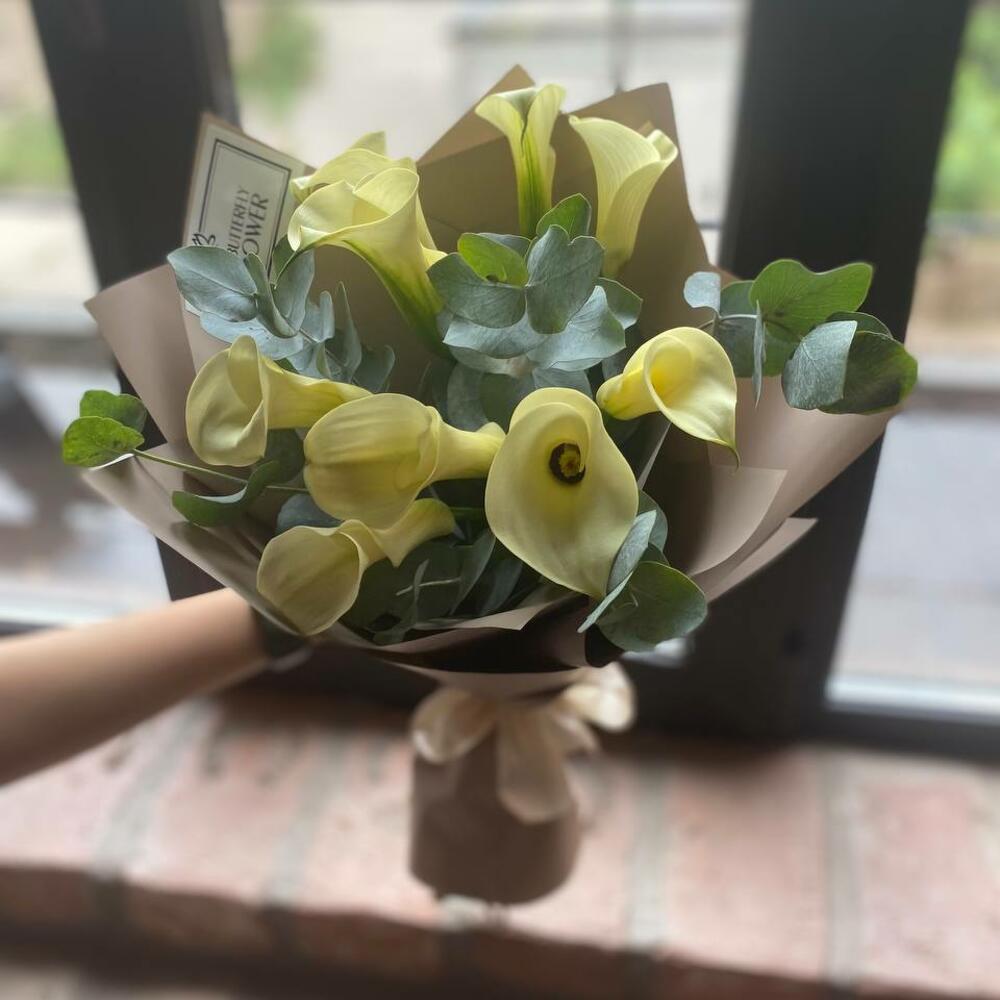 Букет из 9 белых калл с эвкалиптом в упаковке “Весенний туман”