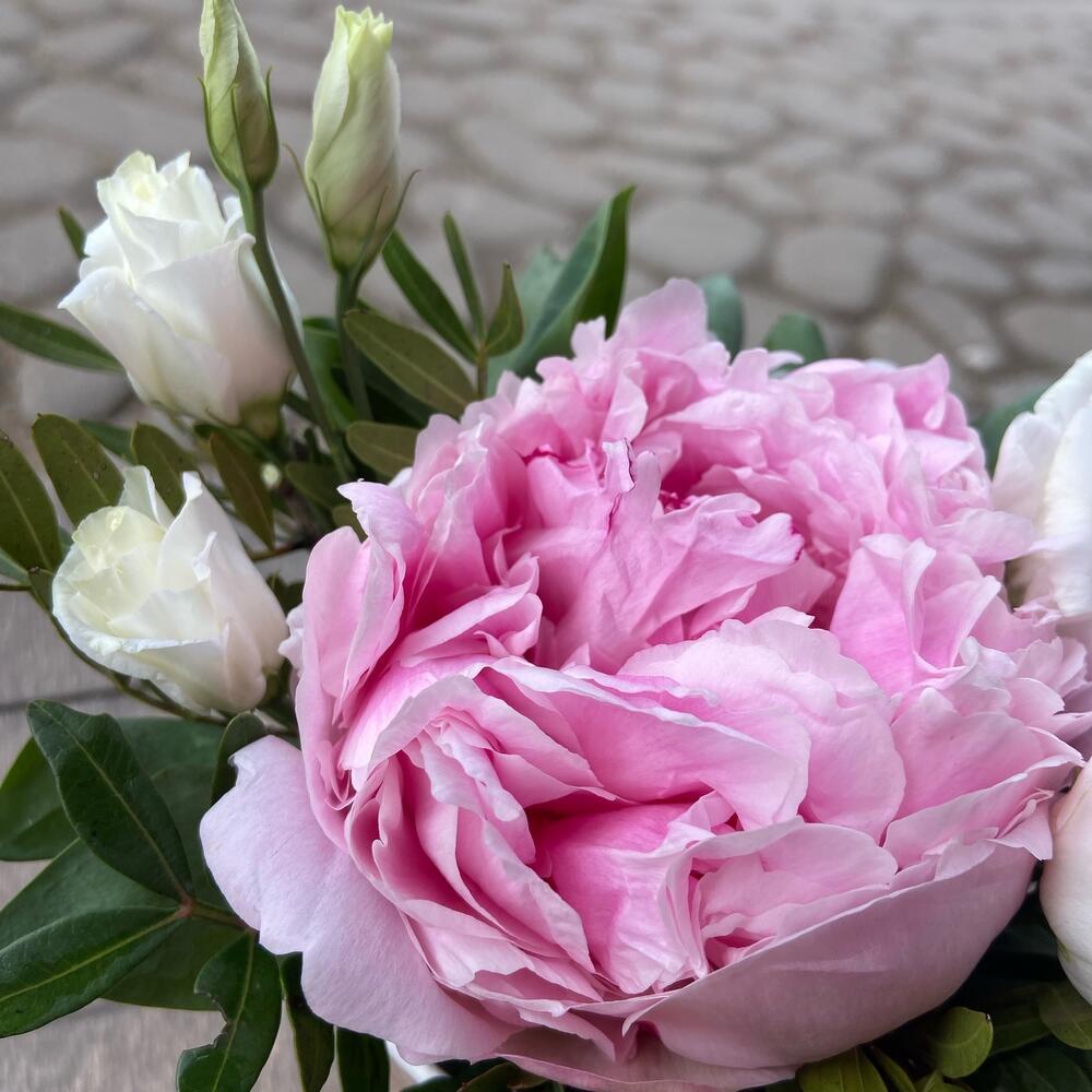 Лизиантус – 1 шт.Пион – 1 шт.Фисташка – 1 шт.Оазис флористический – 1 шт.Стакан крафт дизайнерский – 1 шт.