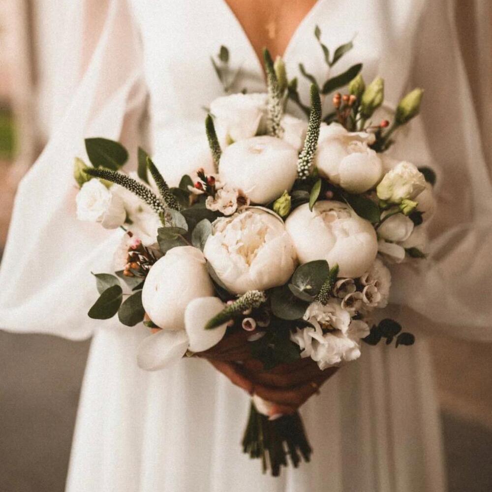 пионы – 9 шт.Ваксфлауэр белый – 2 шт.Вероника – 5 шт.Лента атласная – 5 шт.Лизиантус Алиса белый – 2 шт.Эвкалипт Baby Blue – 1 шт.