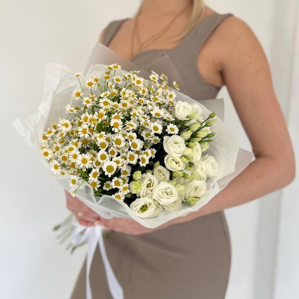 Ароматный букет из ромашек, сантини и стойкой эустомы