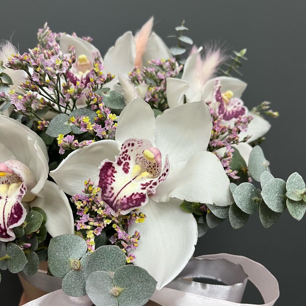 Эвкалипт – 5 шт.Лимониум розовый – 3 шт.Оазис флористический – 1 шт.удлинитель для орхидея – 7 шт.орхидея премиум цимбидиум – 7 шт.шляпная коробка нюдовая – 1 шт.