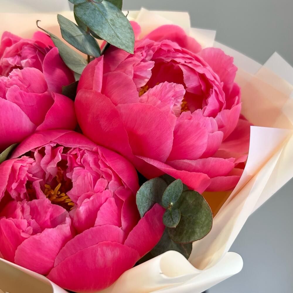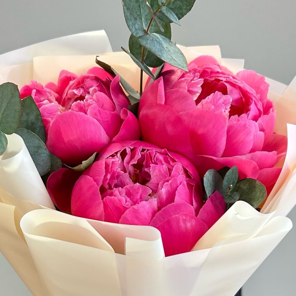 Пион – 3 шт.Эвкалипт – 1 шт.Лента атласная – 1 шт.Упаковка дизайнерская – 2 шт.