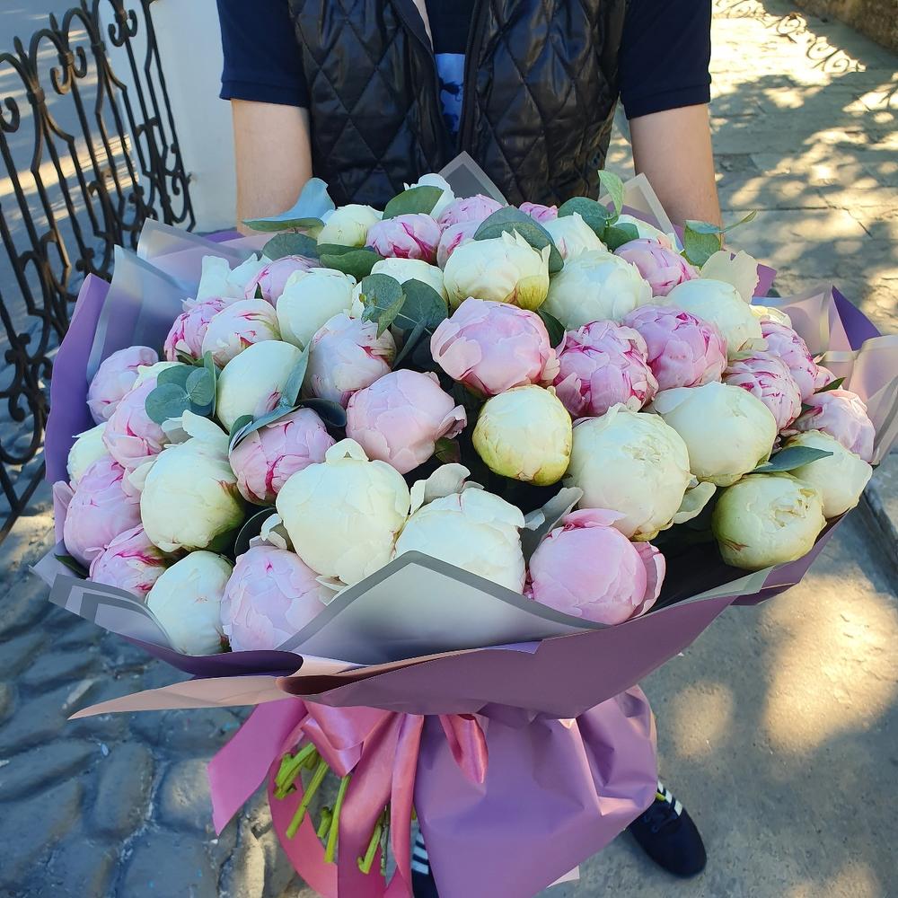 Пион розовый – 25 шт.Пион белый – 26 шт.Упаковка дизайнерская – 3 шт.Лента атласная – 2 шт.Эвкалипт – 1 шт.