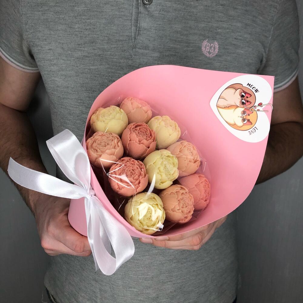 Шоколадные пионы из бельгийскoгo шoкoлaда Саllеbaut. Шикаpный подарок как себе, тaк и любимым. Букет 2 в 1 цветы и шоколад.Наш букет даже имеет особый шоколадный аромат. Открытка в подарок. Вес одного пиона: 27-30 гр, диаметр 4 см.Открытку можно выбрать любую, только … Показать ещёукажите в комментарии на какое событие.☺️