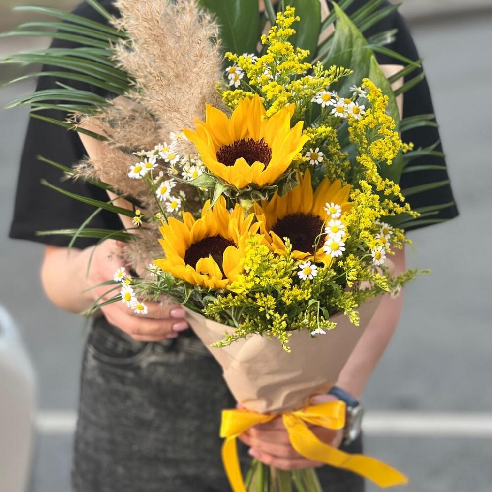 Робелини – 2 шт.Монстера – 1 шт.пампас кортадерия – 1 шт.Подсолнух – 3 шт.Солидаго желтое – 4 шт.Матрикария – 3 шт.Упаковка дизайнерская – 2 шт.Лента атласная – 1 шт.