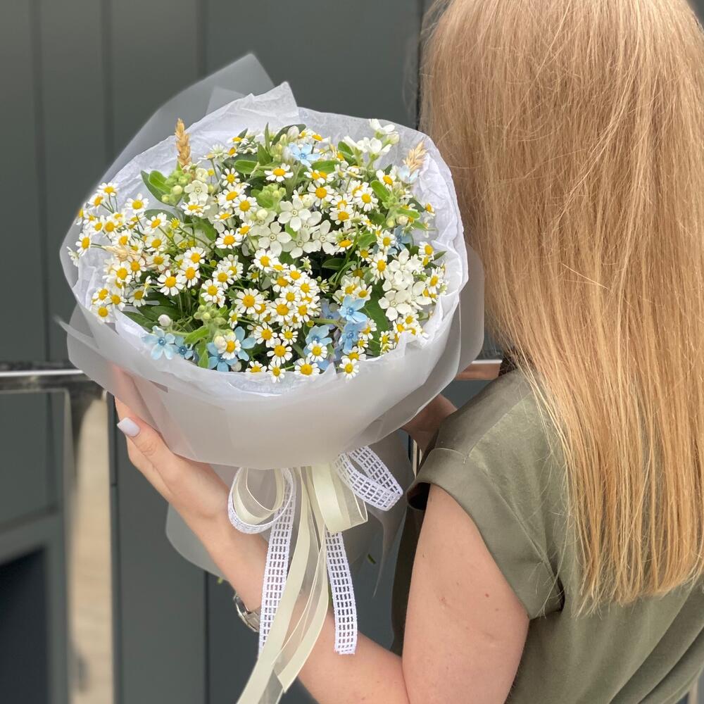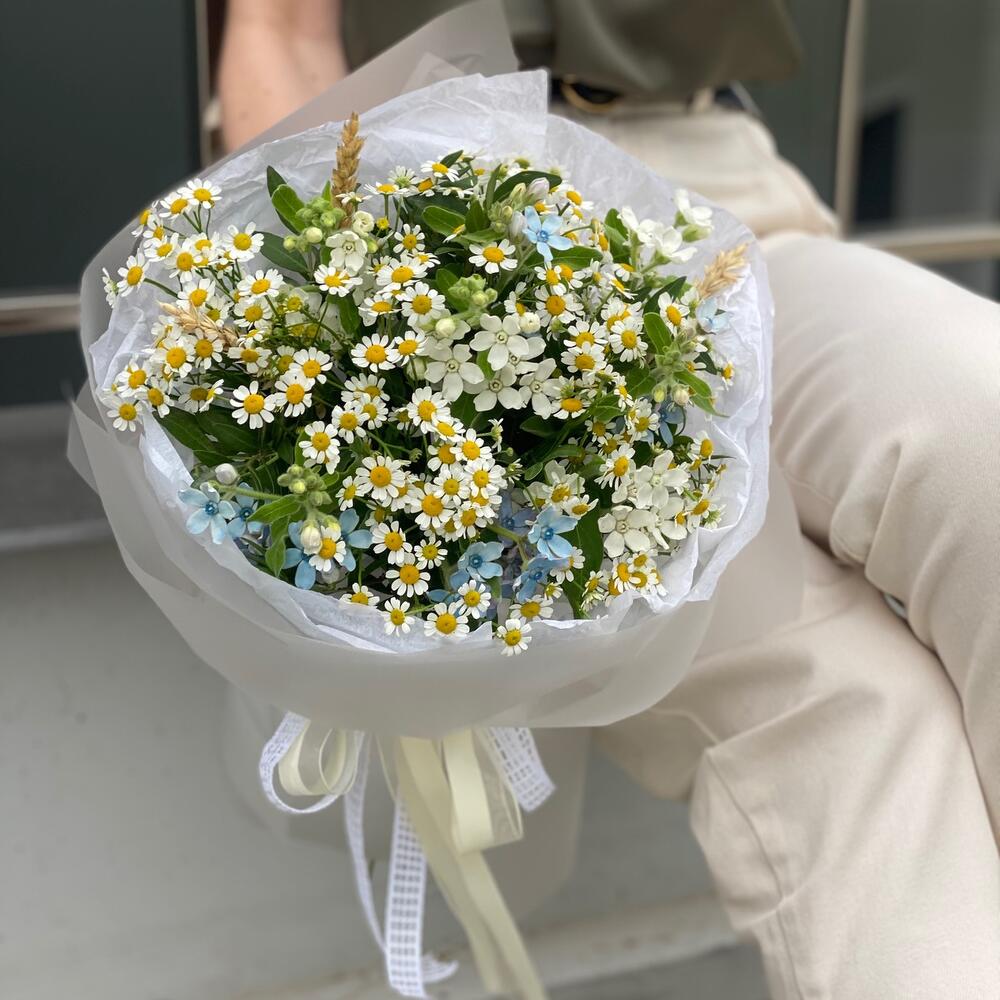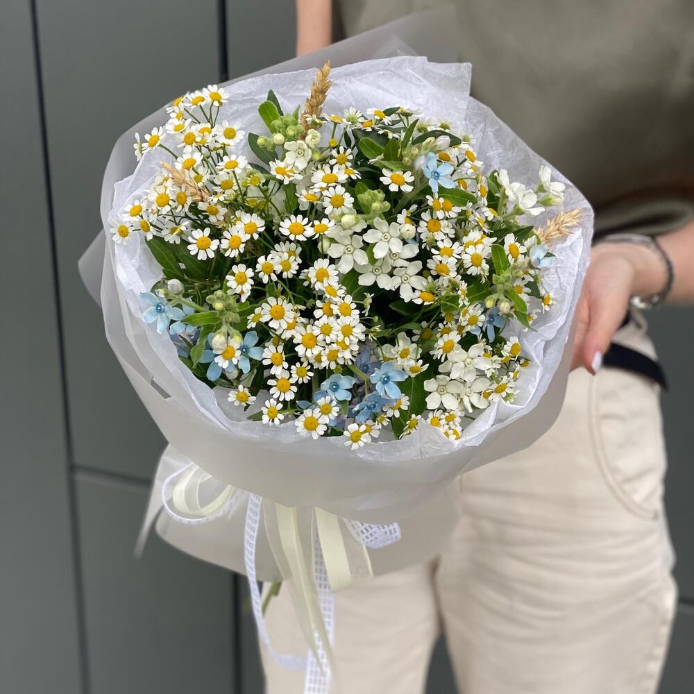 Букет из полевой ромашки и цветков оксипеталума с добавлением колосков в оформлении!