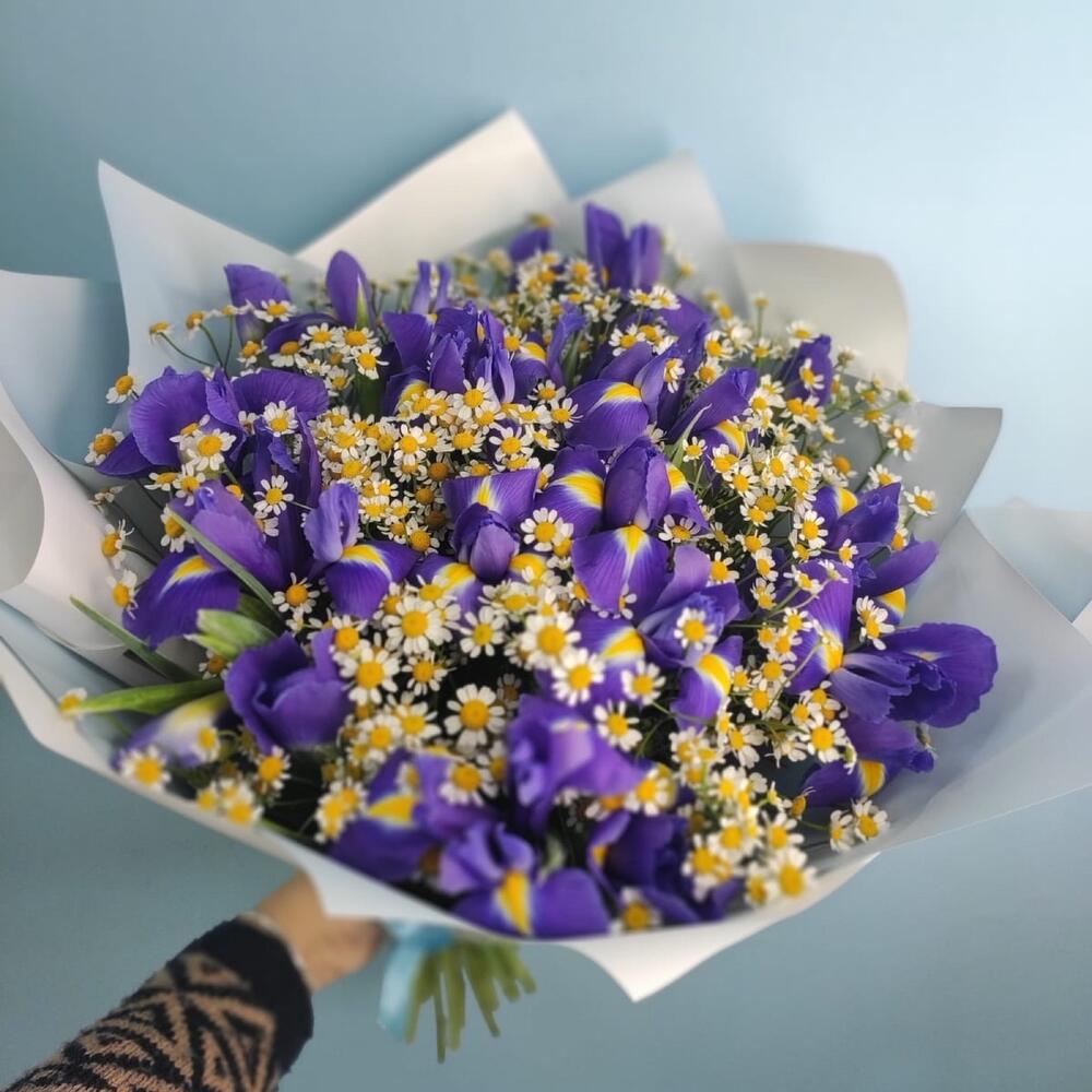 ирисы синие – 19 шт.ромашка кустовая матрикария – 20 шт.Упаковка – 1 шт.Атласная лента – 1 шт.