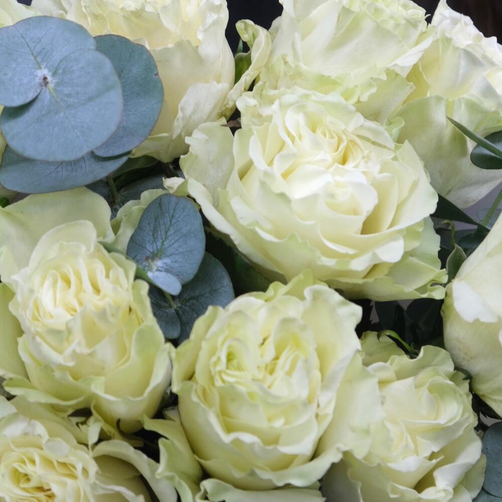 11 белых роз Moonstone с веточками эвкалипта