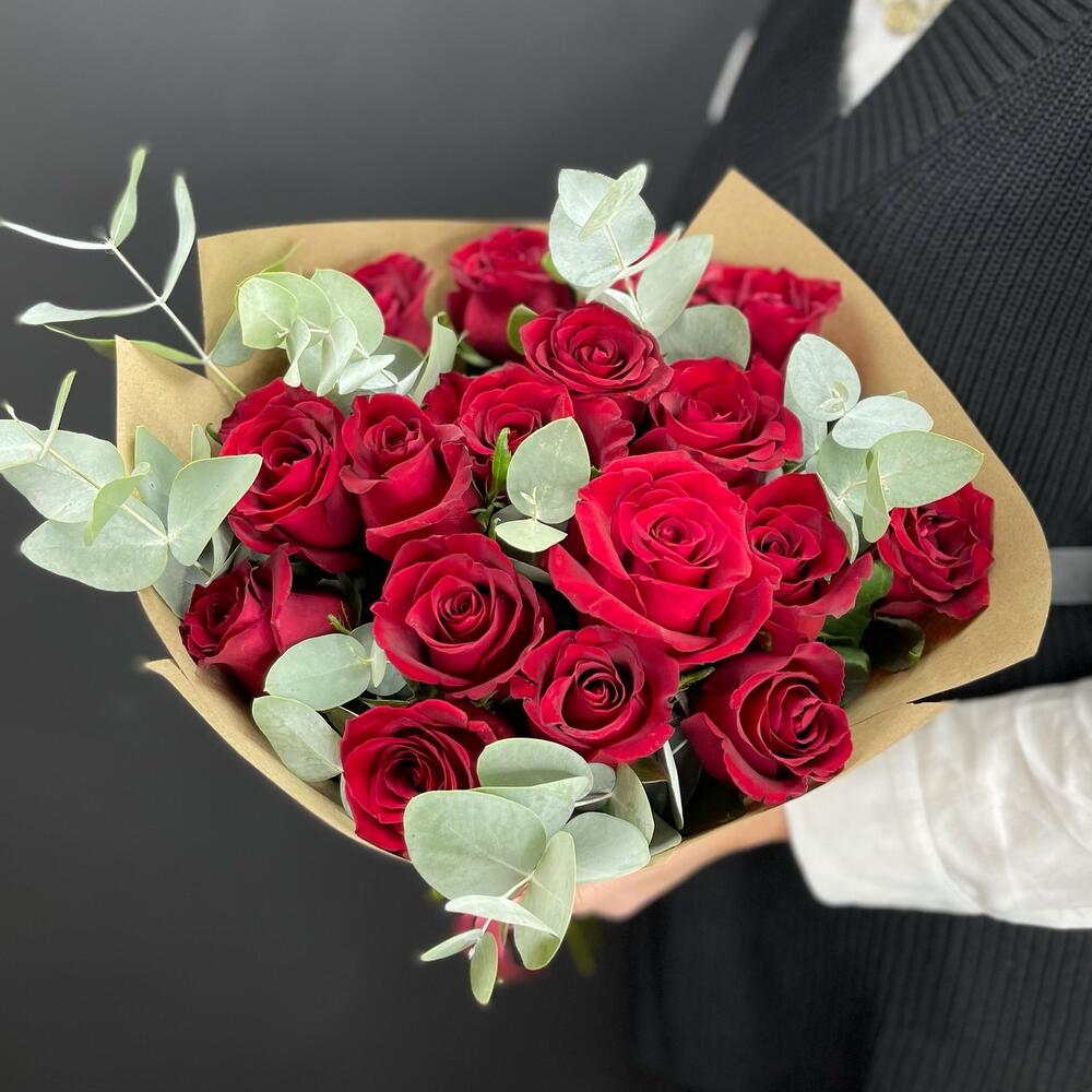 Роза эквадор 55 см – 19 шт.Эвкалипт – 5 шт.Крафт – 3 шт.