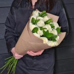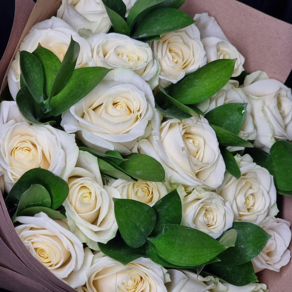 Роза Аваланж – 19 шт.Рускус сочи – 4 шт.Крафт-упаковка – 1 шт.Лента атласная – 1 шт.