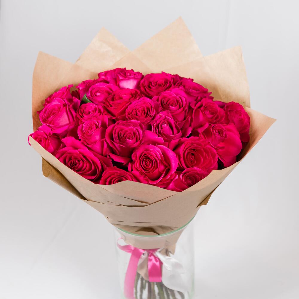 Роза Эквадор – 25 шт.Крафт упаковка – 1 шт.Лента атласная – 1 шт.