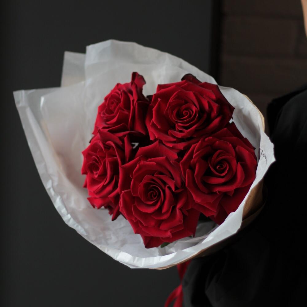 Упаковка дизайнерская – 2 шт.Лента атласная – 2 шт.роза красная эквадор 70 см – 5 шт.