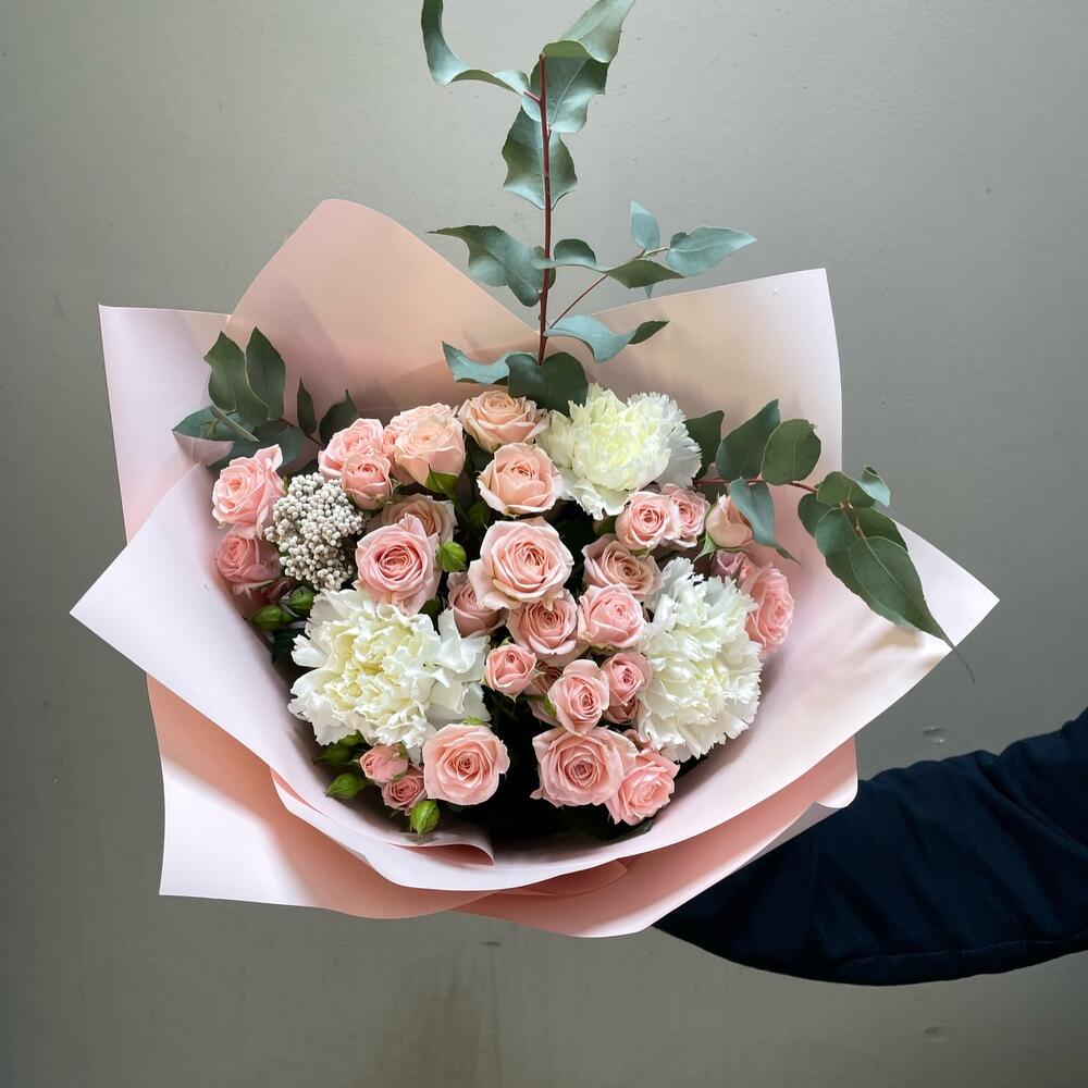 Авторский букет с кустовой розой,диантусами и эвкалиптом