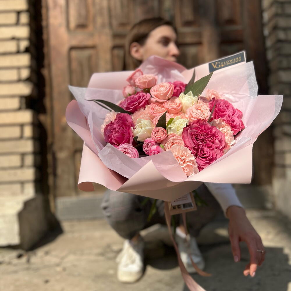 Альстромерии, Гвоздики, Кустовые розы, Лизиантусы, Розы, Хризантемы