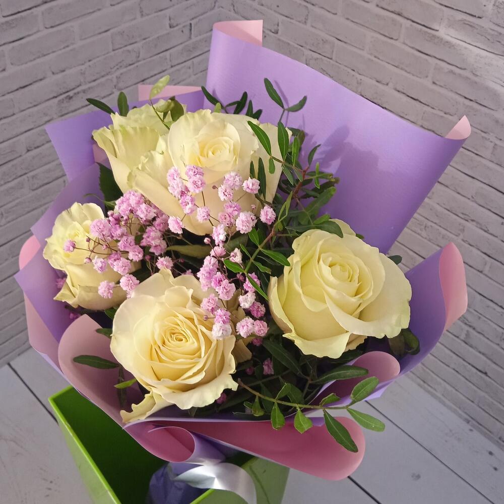 Роза mondial – 5 шт.гипсофила розовая голландская – 1 шт.Фисташка пучок – 1 шт.Упаковка дизайнерская – 1 шт.