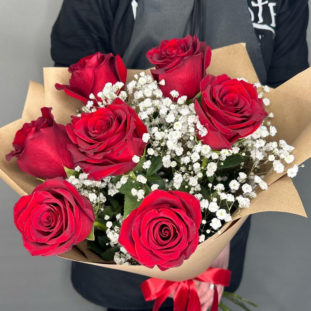 Букет из 7 красных роз и белой гипсофилы “Классика”