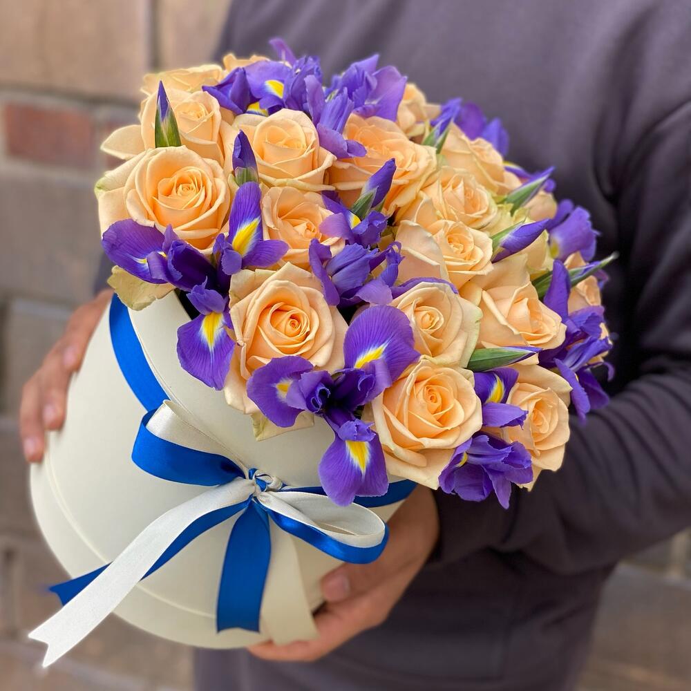 Ирис – 19 шт.Лента атласная – 2 шт.Коробка шляпная – 1 шт.Оазис флористический – 1 шт.Роза кремовая 50 см – 20 шт.