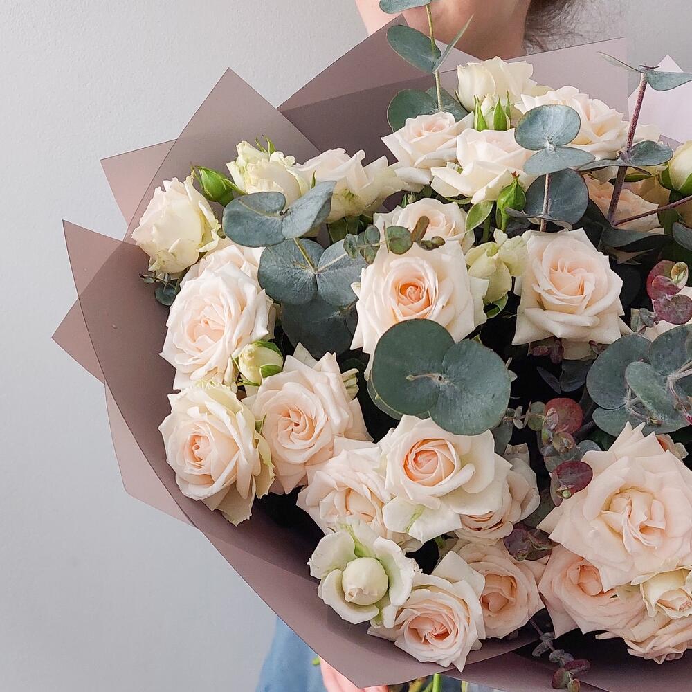 Роза кустовая – 9 шт.Упаковка дизайнерская – 2 шт.Лента органза – 1 шт.Открыточка с вашими пожеланиями – 1 шт.Эвкалипт Baby Blue – 3 шт.