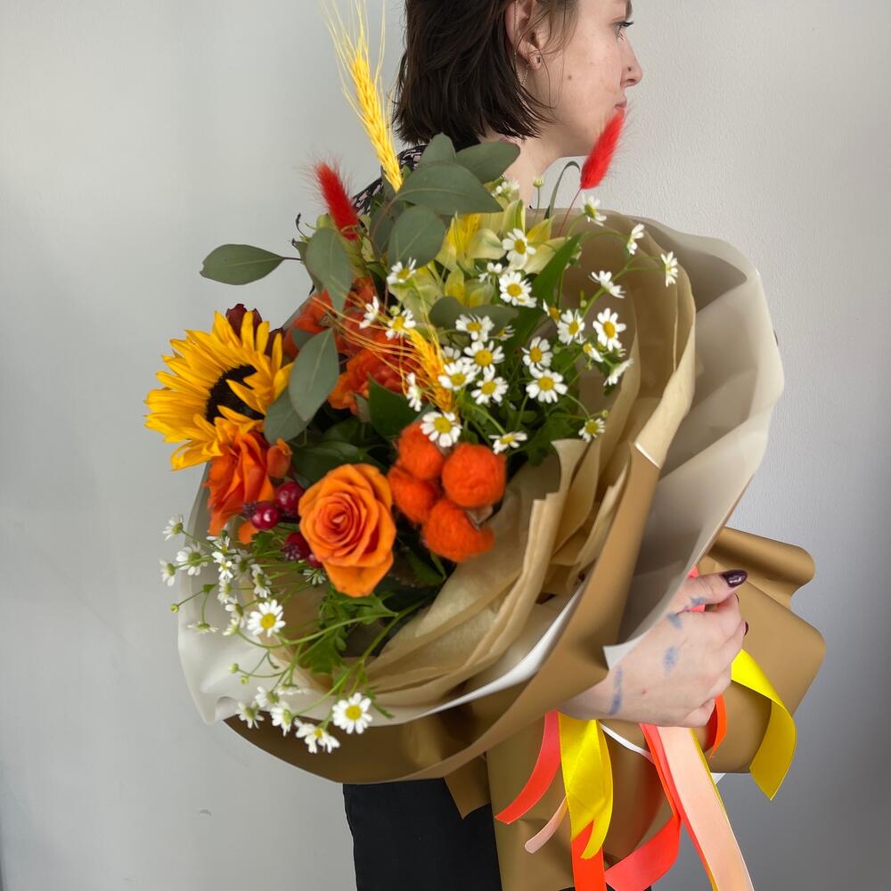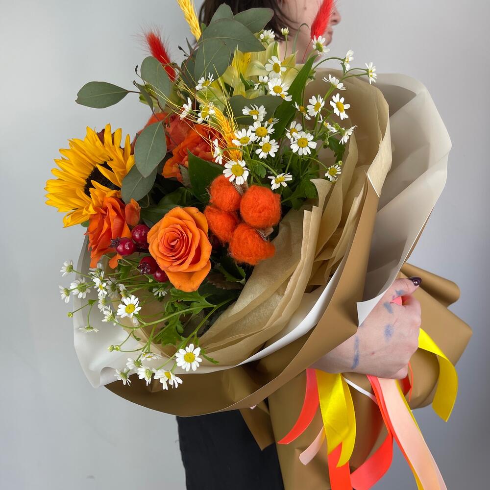 Категорий: Альстромерии, Кустовые розы, Подсолнухи, Розы, Ромашки, Сухоцвет