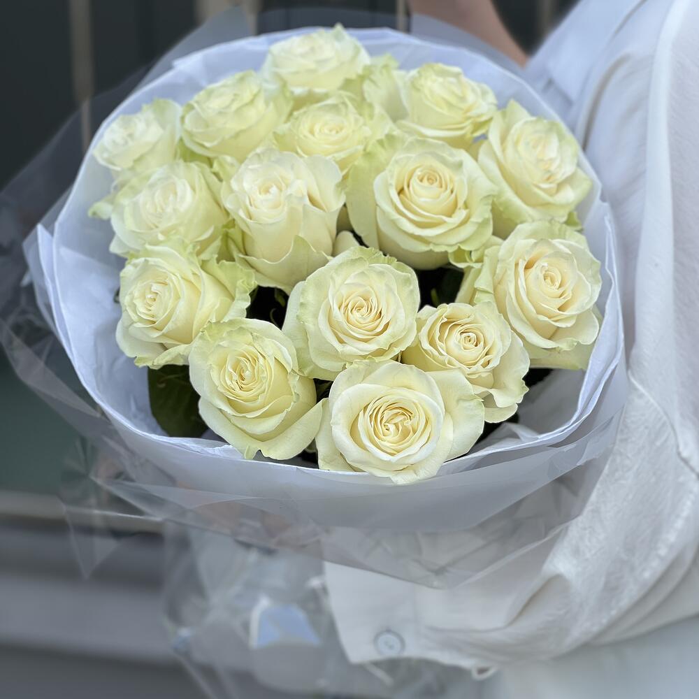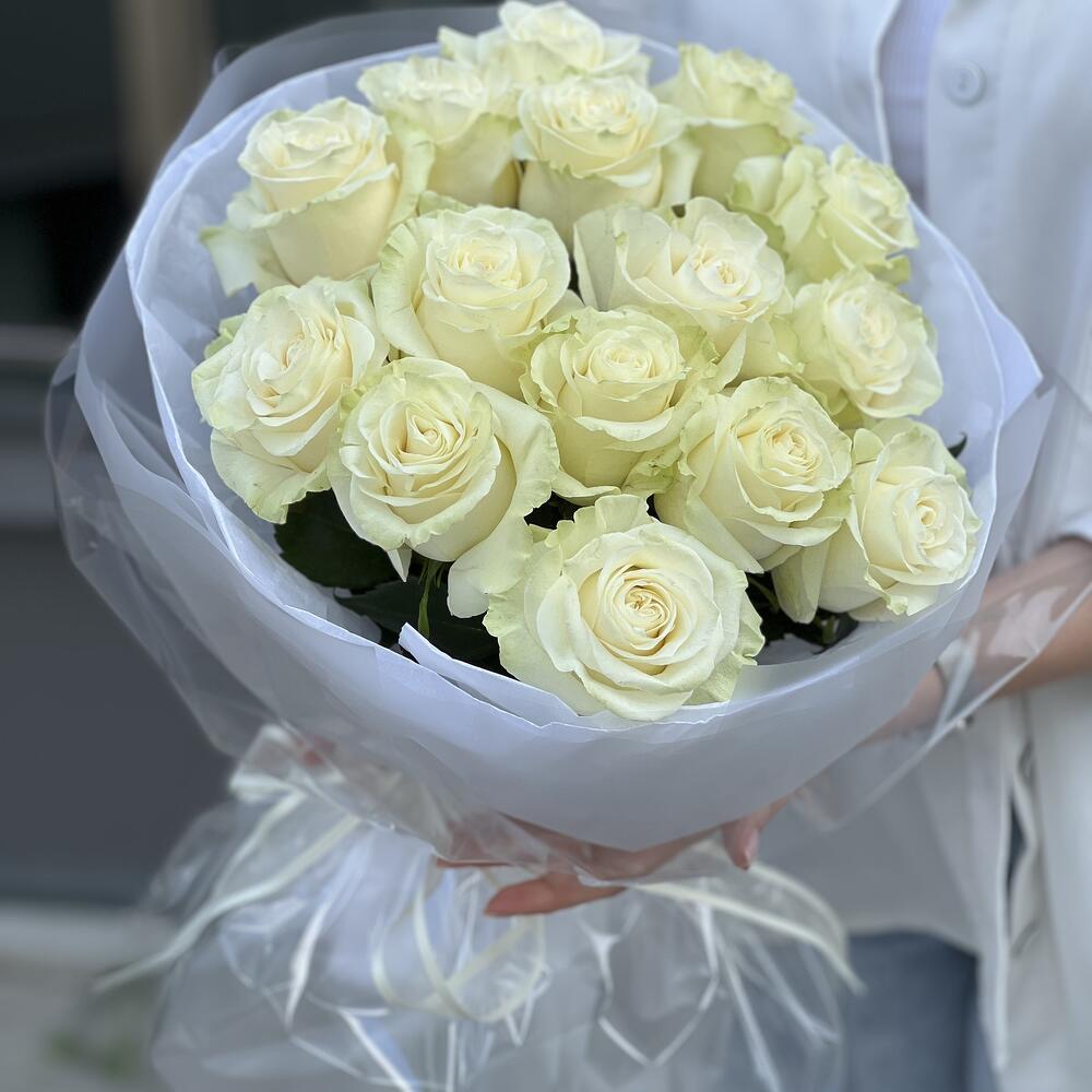 Роза белая – 15 шт. Оформление – 1 шт.