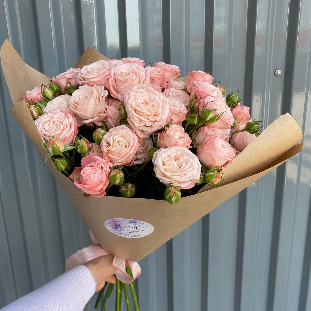 Лента атласная – 1 шт.Крафт упаковка – 1 шт.Роза кустовая пионовидная бомбастик – 10 шт.