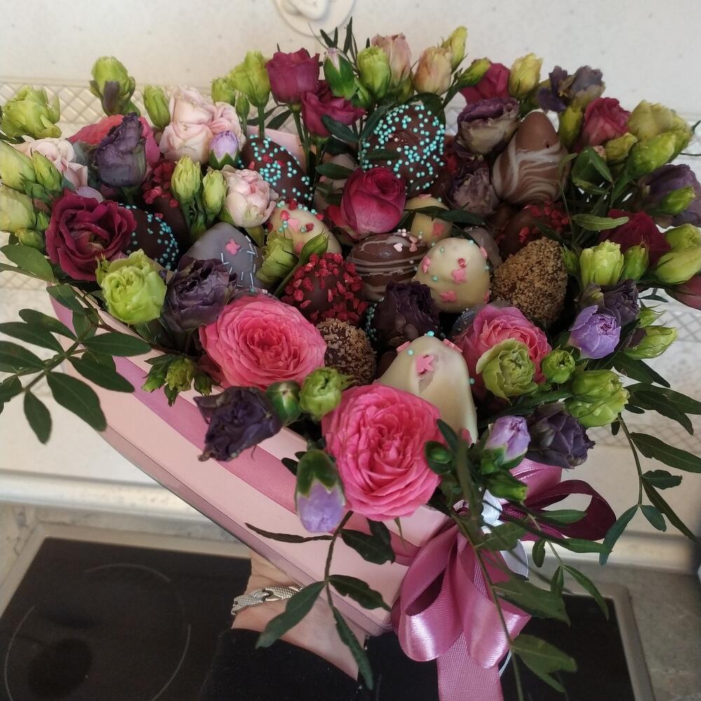 Роза кустовая – 2 шт.эустома фиолетовая – 3 шт.Упаковка дизайнерская – 1 шт.Коробка сердце – 1 шт.эустома розовая – 3 шт.Фисташка пучок – 2 шт.Клубника в шоколаде callebaut (бельгия) – 25 шт.Губка флористическая – 1 шт.ленты атласные – 3 шт.пленка траспортировочная – 1 шт.