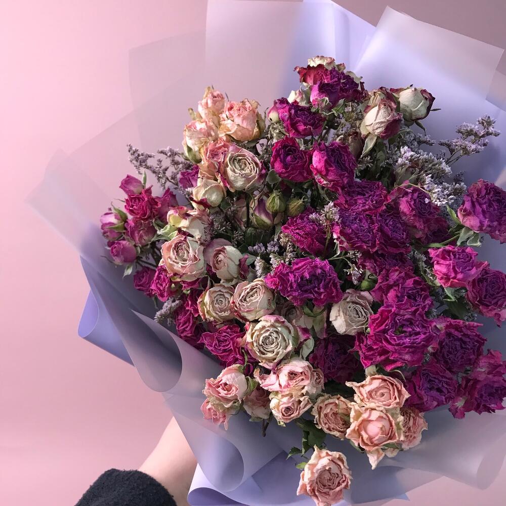 роза кустовая засушенная – 11 шт.лимониум засушенный – 5 шт.Оформление – 1 шт.