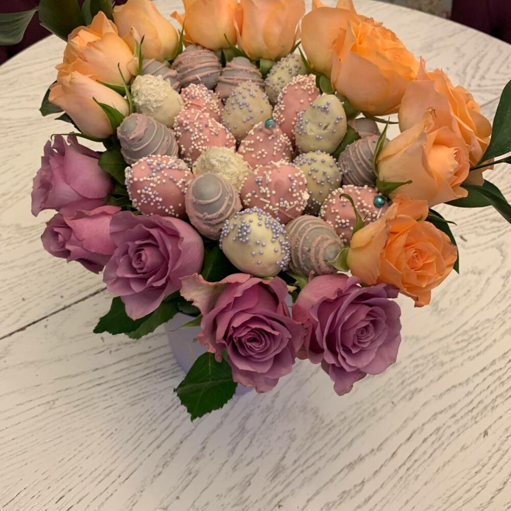 Букетиз клубники в шоколаде с розами “Лиловый фреш”