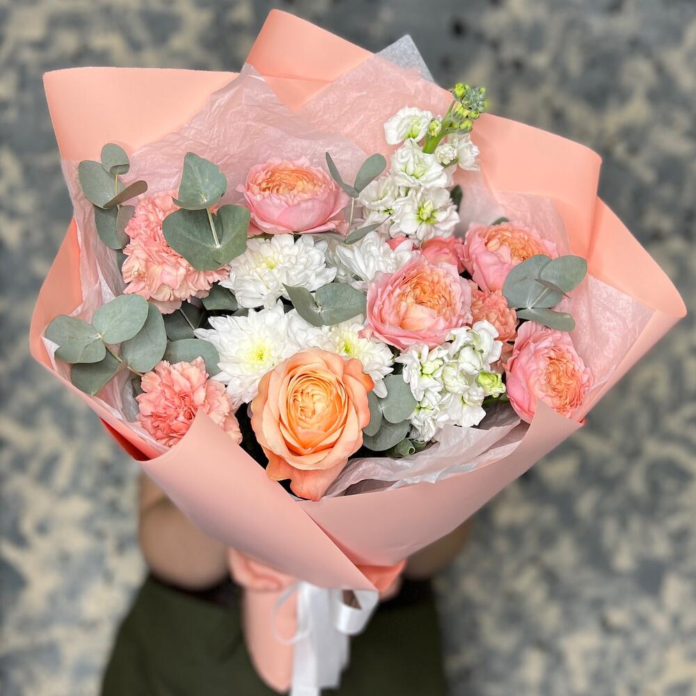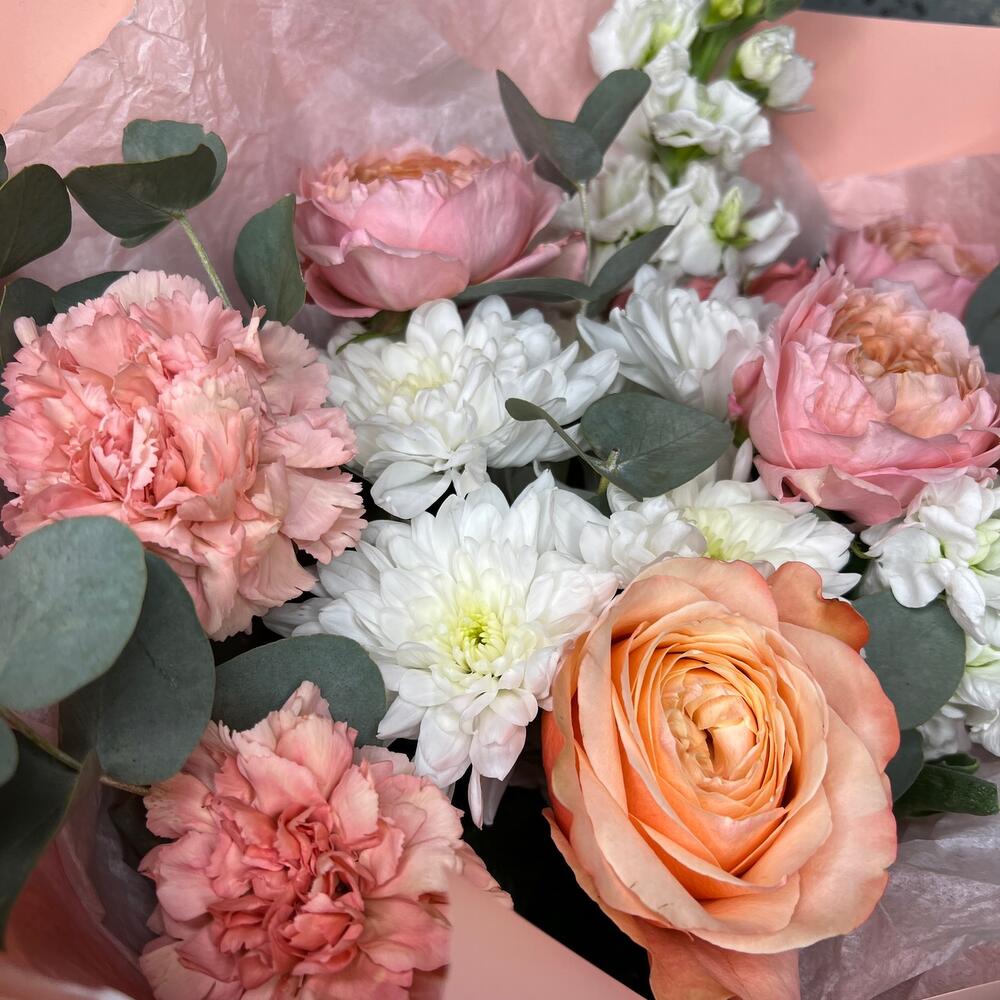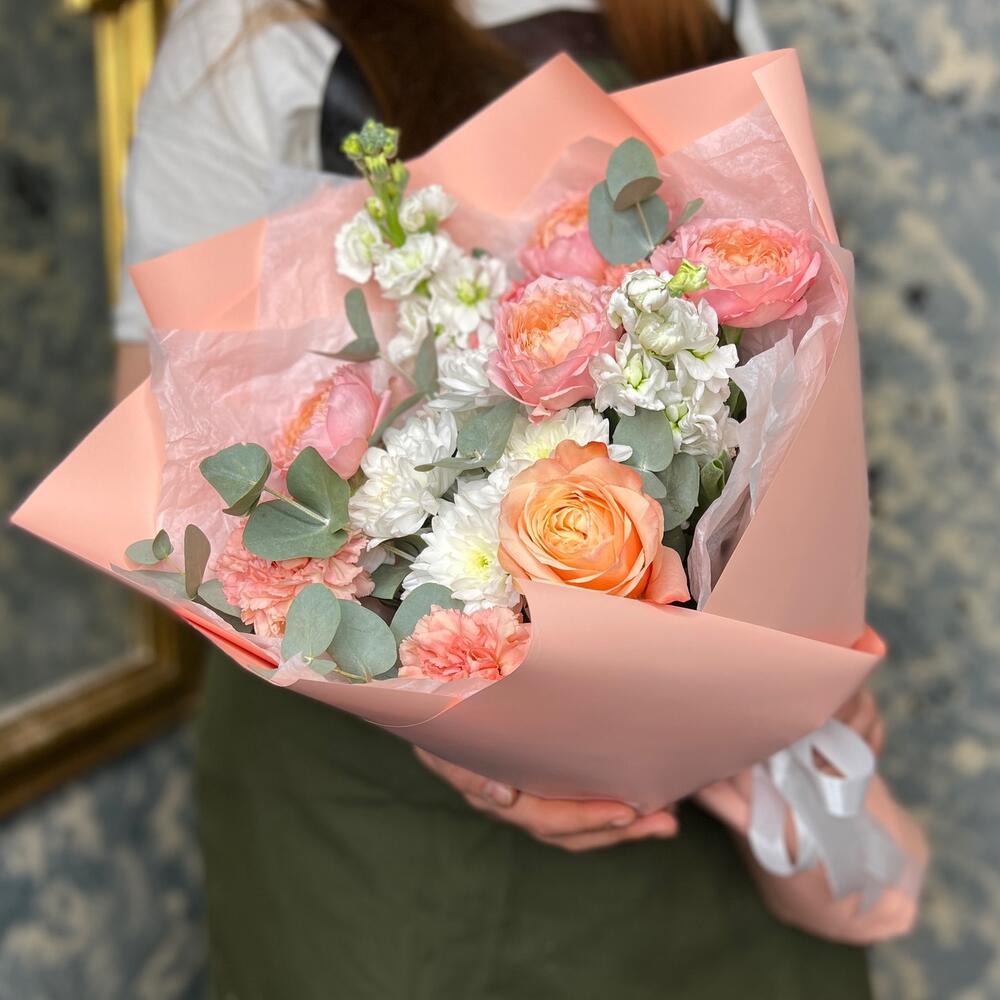 Роза кустовая пионовидная джульетта – 1 шт.Маттиола – 2 шт.Хризантема кустовая – 1 шт.Роза пионовидная кахала – 1 шт.Диантус – 3 шт.Эвкалипт – 3 шт.Тишью белое – 2 шт.Пленка матовая – 5 шт.Лента атласная – 2 шт.