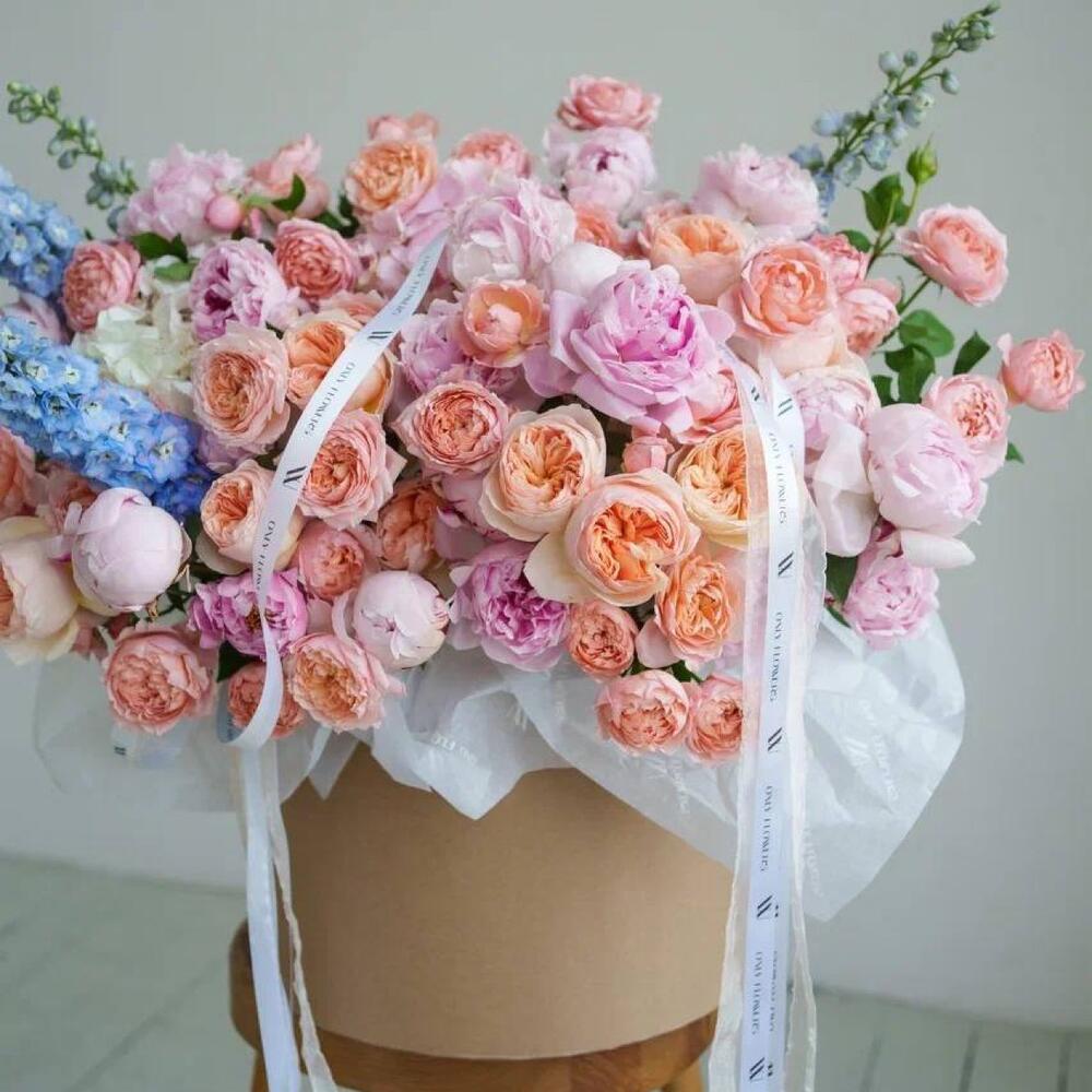 Гортензия – 5 шт.Дельфиниум – 10 шт.Пион – 20 шт.Лента атласная – 4 шт.Роза кустовая пионовидная – 25 шт.Коробка шляпная большая – 1 шт.Открыточка с вашими пожеланиями – 1 шт.Оазис флористический – 4 шт.роза одноголовая джульетта – 20 шт.
