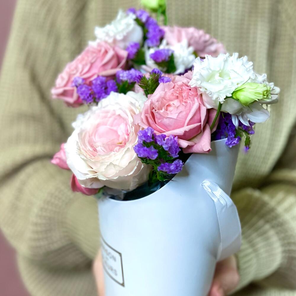 Роза пионовидная – 1 шт.Роза кустовая розовая – 1 шт.Лизиантус – 2 шт.Хризантема кустовая – 1 шт.Статица синяя – 1 шт.Коробка – 1 шт.